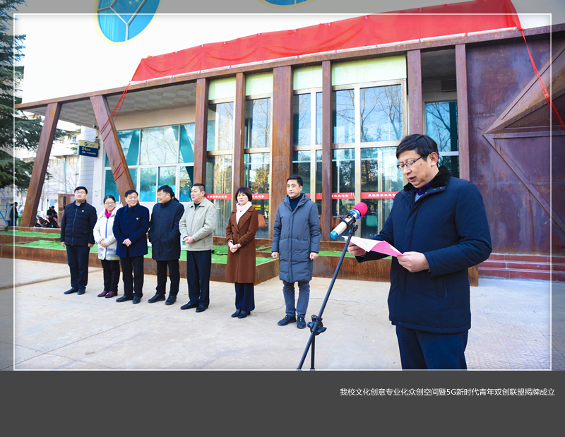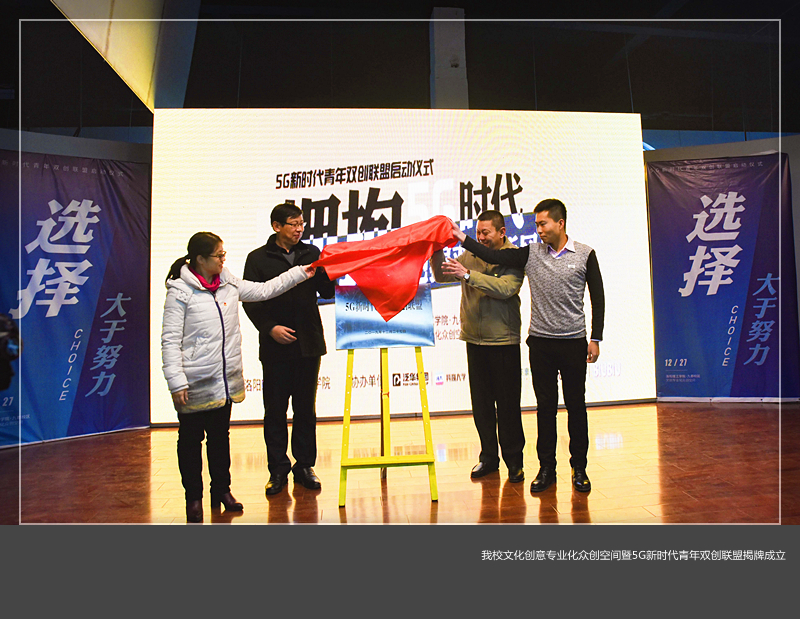 12月27日上午,我校文化创意专业化众创空间揭牌仪式暨5G新时代青年双创联盟启动仪式在九都校区举行。副校长李大伟、王晓峰,洛阳市委宣传部副部长谢中岳,涧西区政协主席杨超群,洛阳科技情报所所长马芳、团市委副书记张田等出席了揭牌活动。