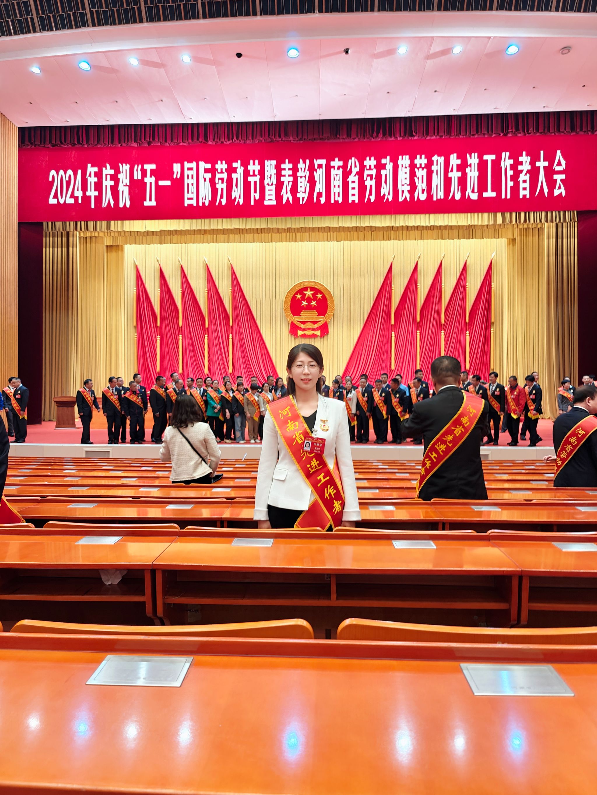 4 月 30 日上午,河南省2024年庆祝“五一”国际劳动节暨表彰河南省劳动模范和先进工作者大会在郑州隆重召开,来自全省各界的劳动模范和先进工作者受到表彰。我校数学与物理教学部教师景元萍被中共河南省委、河南省人民政府授予“河南省先进工作者”荣誉称号。