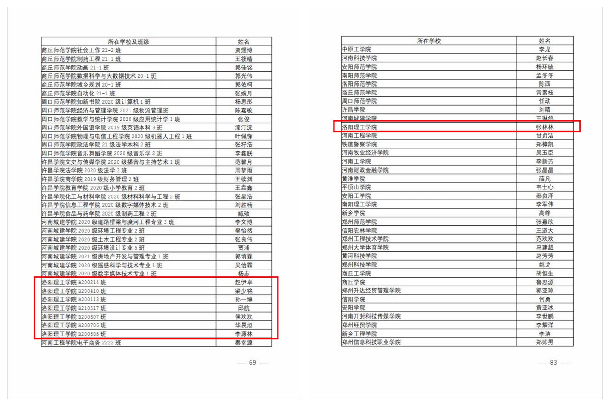 近日,中共河南省委教育工委、河南省教育厅公布2023年度全省教育系统“两创两争”活动先进集体和先进个人评选结果,我校3个班级、3个宿舍、1个社团、5名教师、7名学生分别获得先进集体和先进个人荣誉称号。