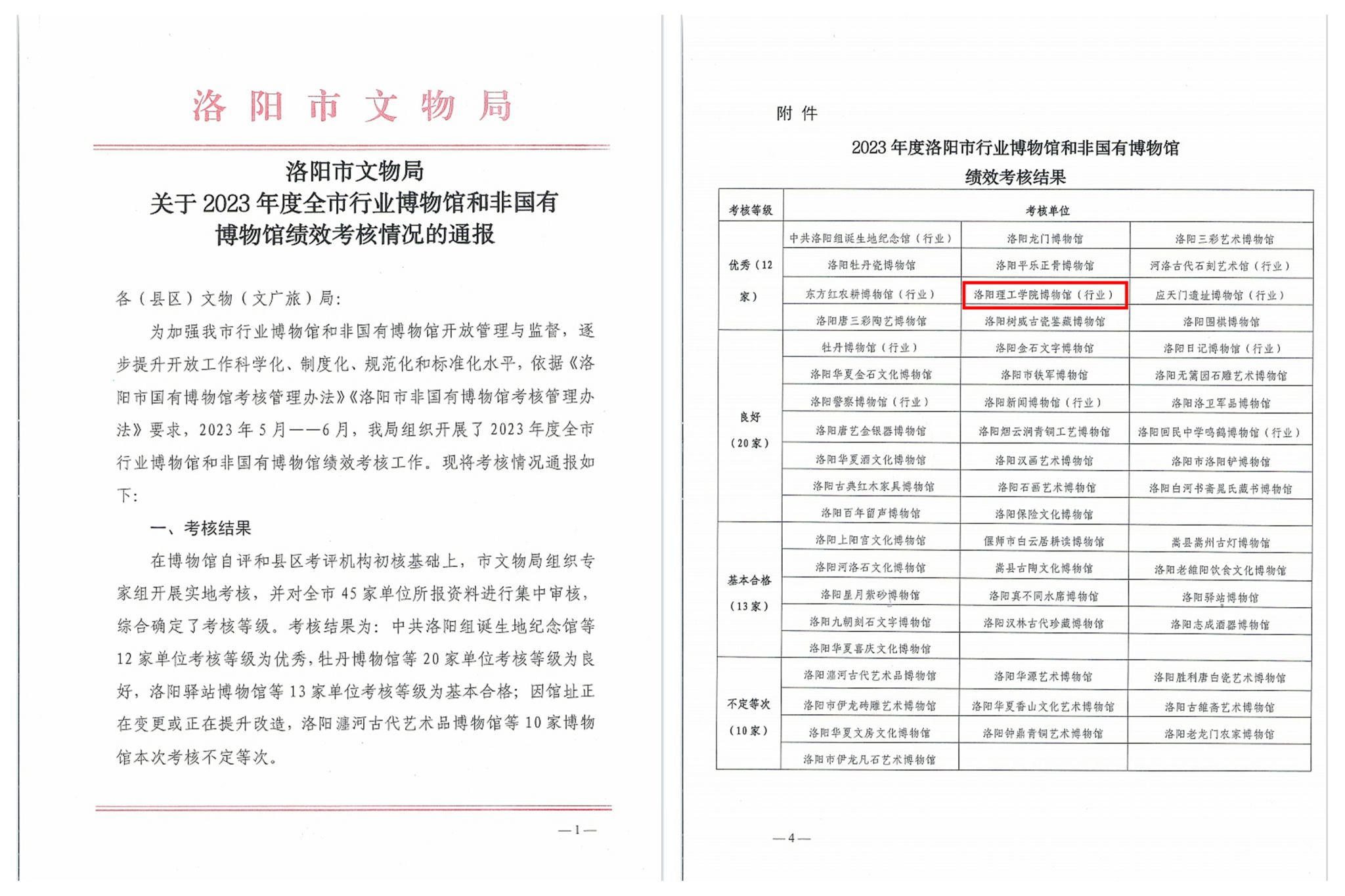 近日,洛阳市文物局发布了《关于2023年度全市行业博物馆和非国有博物馆绩效考核情况的通报》,经过博物馆自评、县区考评机构初核、市文物局组织专家组开展实地考核等环节,乐鱼(中国)博物馆获评2023年度绩效考核优秀(全市12家博物馆被评定为优秀)。这是我馆自2022年开馆以来,连续两年获评绩效考核等级优秀。