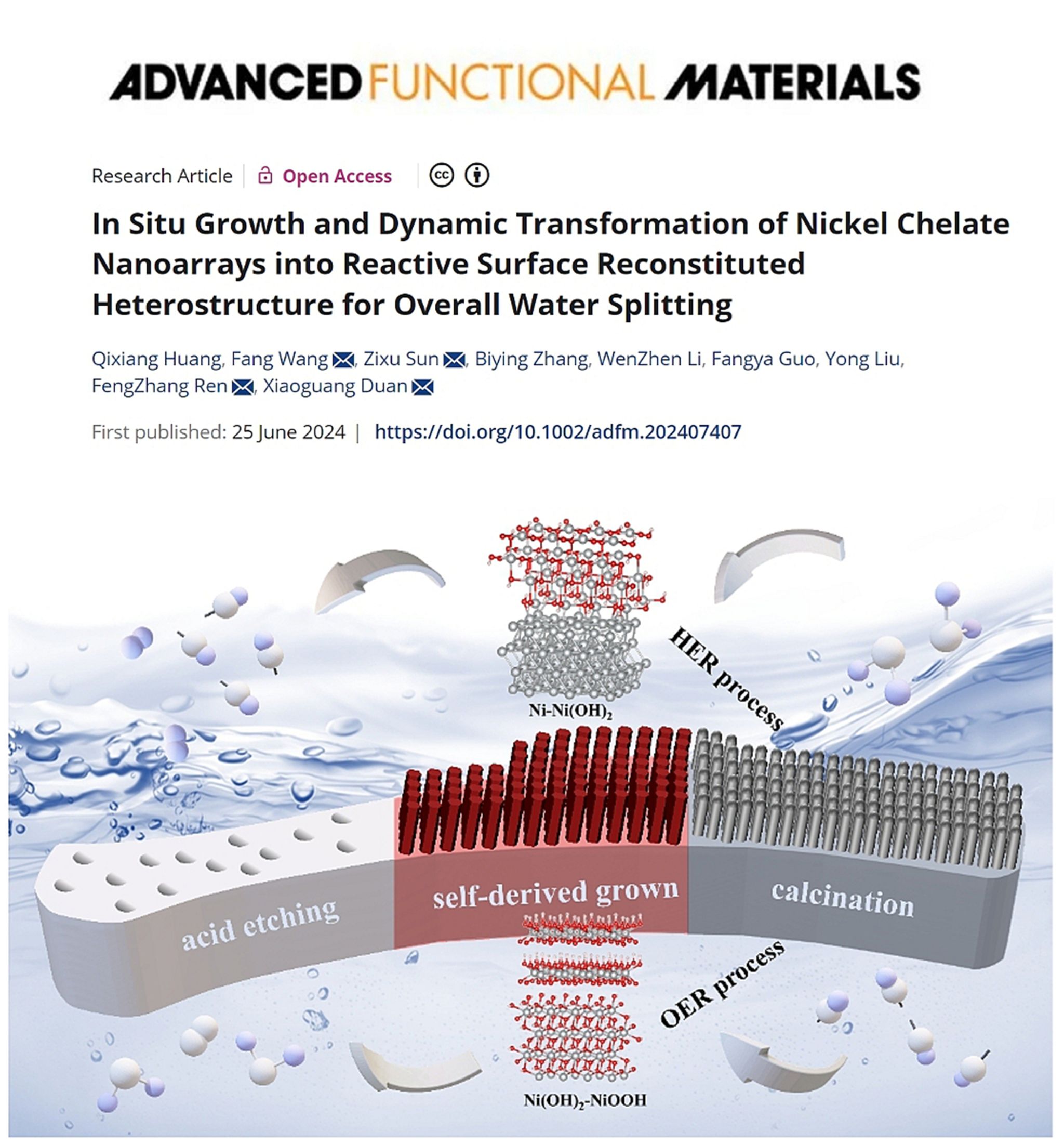 近日,我校环境工程与化学学院王芳教授在国际材料科学领域顶级期刊《Advanced Functional Materials》(《先进功能材料》)发表题为“In-situ growth and dynamic transformation of Nickel chelate nanoarrays into reactive surface reconstituted heterostructure for overall water splitting”的研究论文。乐鱼(中国)为该论文第一完成单位和通讯单位,环境工程与化学学院联合培养硕士研究生黄奇祥为论文第一作者,王芳教授为该论文第一通讯作者。该项工作得到了国家自然科学基金、河南省高校科技创新团队、河南省科技攻关等项目的资助。