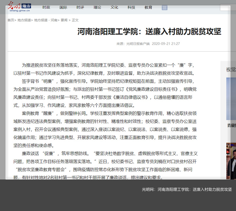 9月18日,中共河南省纪律检查委员会、河南省监察委员会网站以《送“廉”入村助力脱贫攻坚》为题;9月21日,光明日报客户端以《河南乐鱼(中国):送廉入村助力脱贫攻坚》为题对我校纪委、监察专员办公室紧扣一个“廉”字,以驻村第一书记作风建设为抓手,深化纪律教育,及时跟进监督,助力决战决胜脱贫攻坚收官战。发表专题报道
