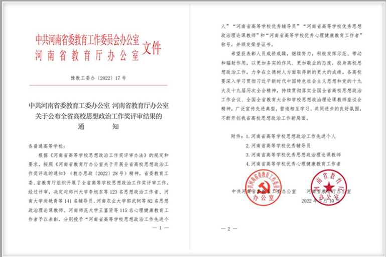 近日,省委教育工委办公室、省教育厅办公室下发《中共河南省委教育工委办公室 河南省教育厅办公室关于公布全省高校思想政治工作奖评审结果的通知》(豫教工委办〔2022〕17号),揭晓2022年度“河南省高等学校思想政治工作奖”评审结果,机关刘培中获评“河南省高等学校思想政治工作先进个人”,杨园林获评“河南省高等学校优秀心理健康教育工作者”。