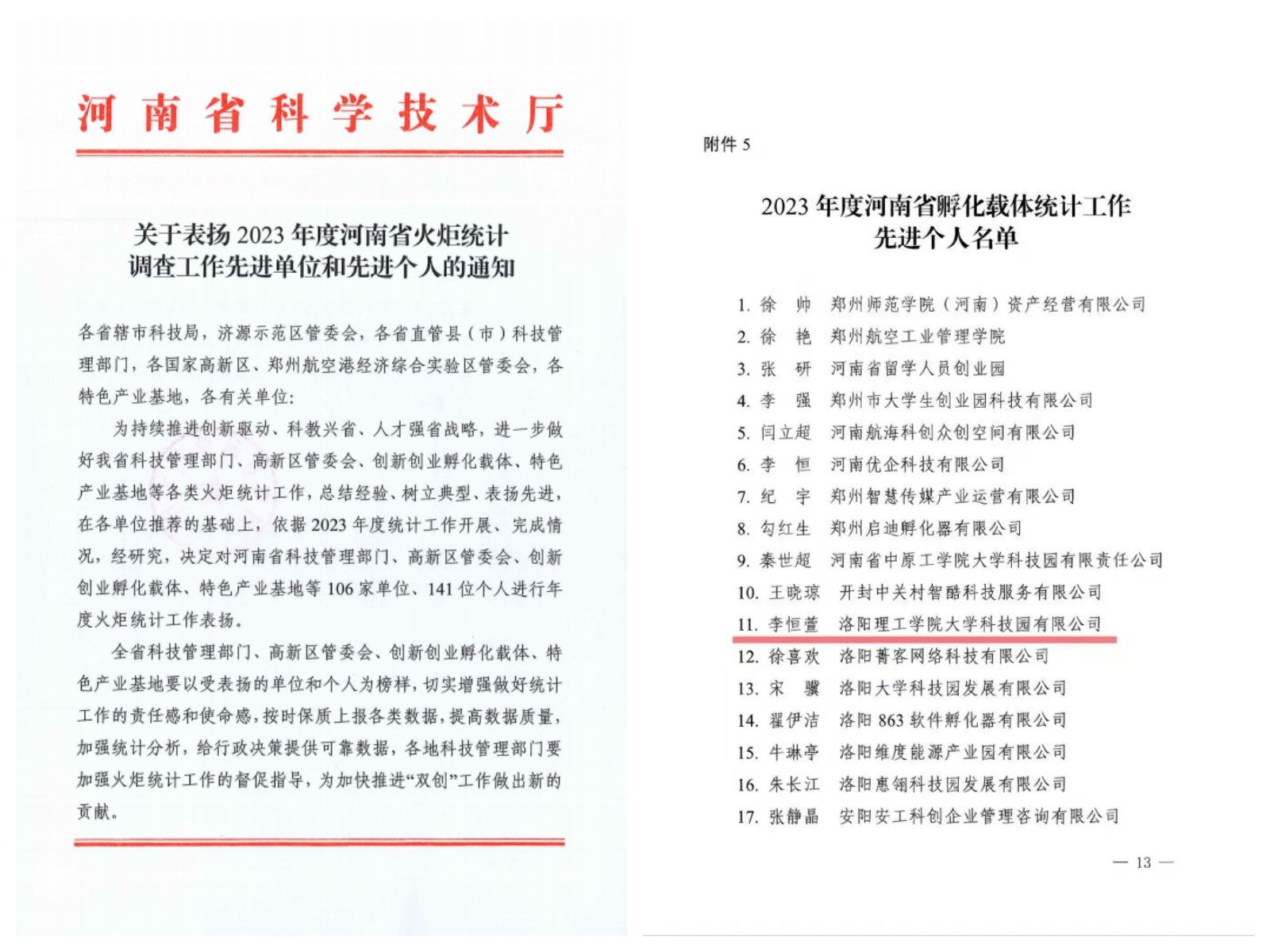 近日,河南省科学技术厅对全省2023年度在火炬统计工作中表现突出的106家单位、141位个人进行发文表扬。其中,乐鱼(中国)国家大学科技园创新发展部部长李恒萱荣获“河南省创新创业孵化载体统计工作先进个人”荣誉称号。