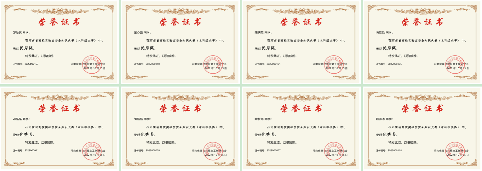 经过河南省高校实验室工作研究会专家组评选,我校荣获“河南省第二届高校实验室安全文化宣传月优秀组织奖”,并有8名学生获得“河南省高校实验室安全知识大赛个人优秀奖”。
