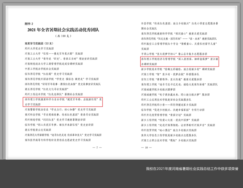 近日,共青团河南省委下发了《关于2021年全省暑期社会实践活动省级优秀工作典型的通报》,系统梳理总结了2021年度全省“三下乡”“返家乡”社会实践工作,并对积极组织、指导和参与社会实践活动并取得优秀成果的有关团组织、实践单位、实践团队、品牌项目等进行了表彰。经资格审核、组织评议等多个环节,我校团委被评为“2021年全省暑期社会实践活动优秀单位”、教育科学与音乐学院“建党百年路,启航新征程”党史学习实践团、经济与管理学院“深入浙西南,细研畲族梦”浙江丽水调研实践团被评为省级优秀团队、向日葵支教团“心灵陪跑,一直在路上”品牌项目被评为省级优秀品牌项目。