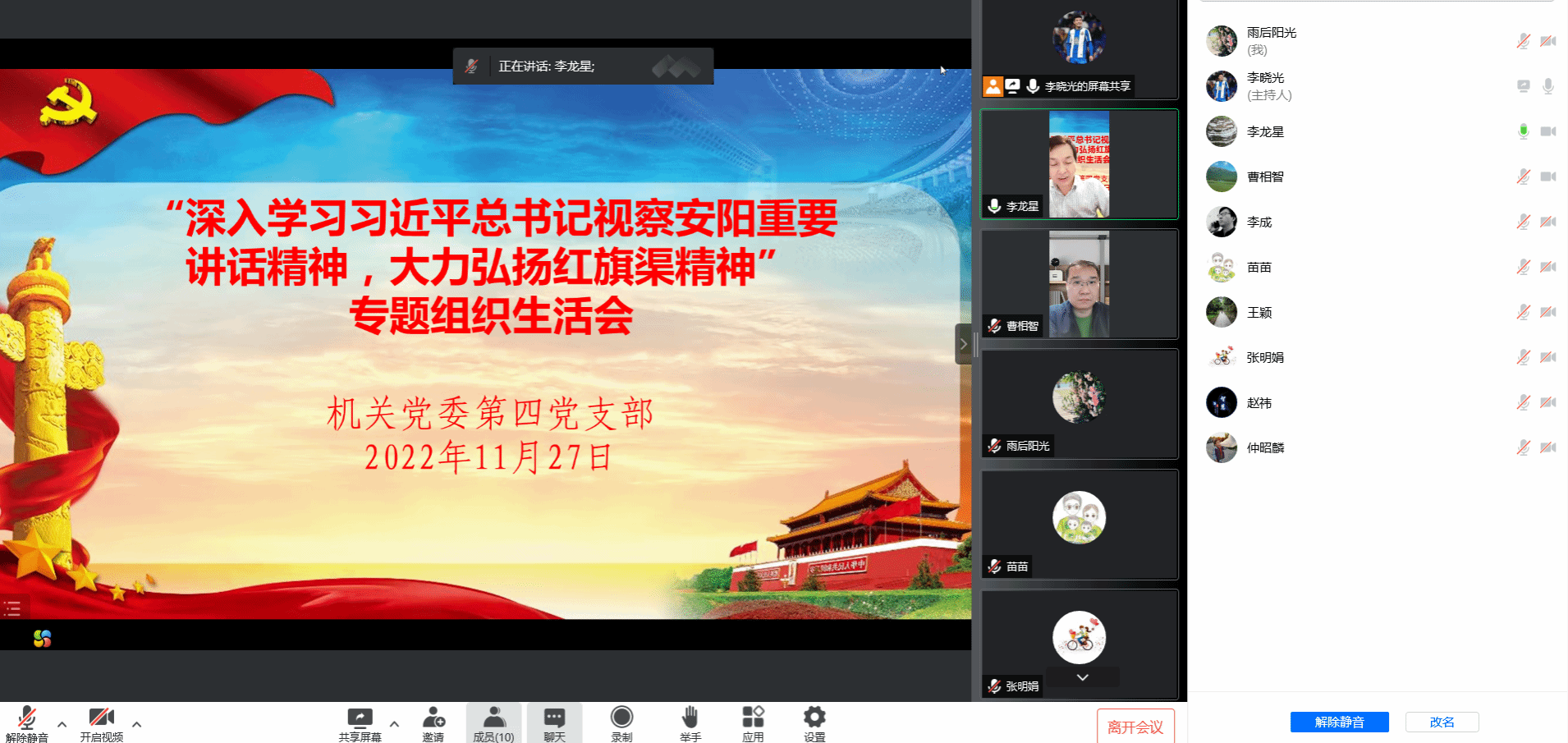 2022年11月27日下午15点—17点,机关党委第四党支部召开“深入学习习近平总书记视察安阳重要讲话精神,大力弘扬红旗渠精神”专题组织生活会,会议以腾讯会议形式进行。