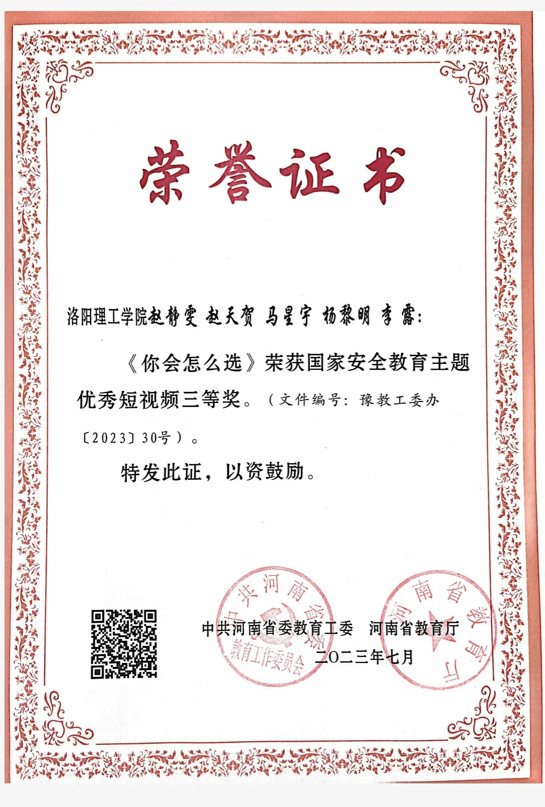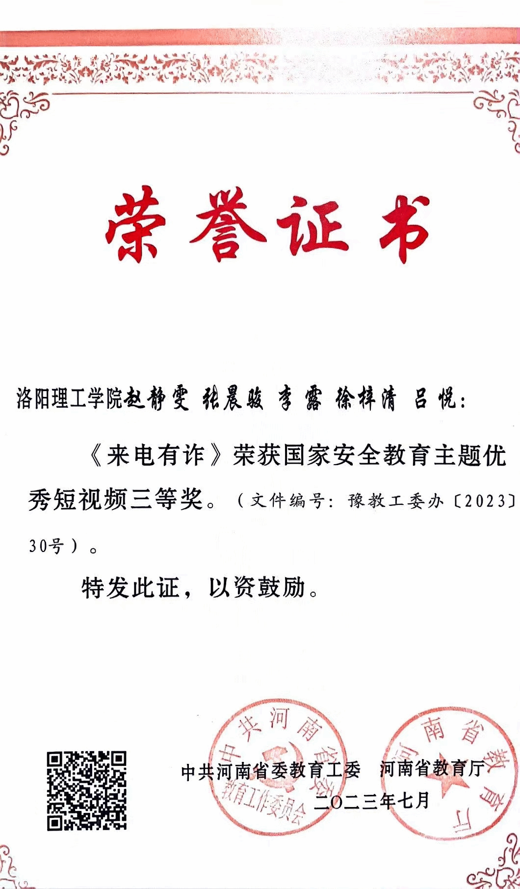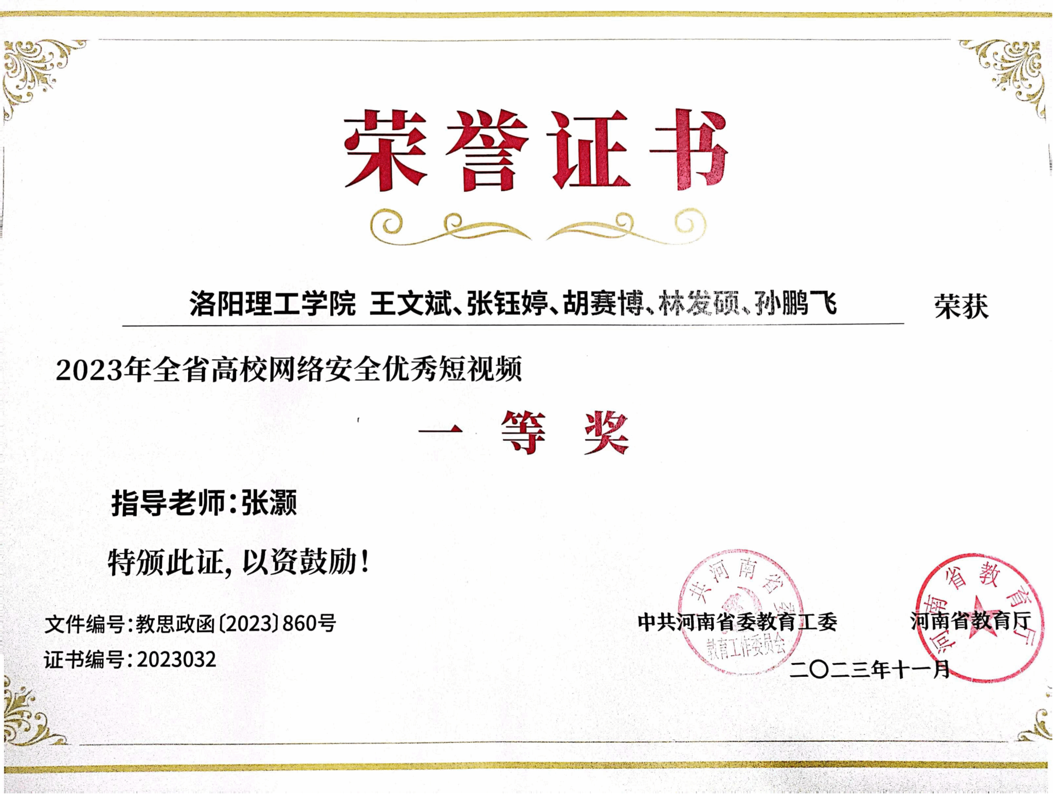 河南省教育厅下发了《关于公布全省高校网络安全优秀作品征集活动评审结果的通知》,我院张灏老师指导的短视频作品《入局》荣获一等奖。