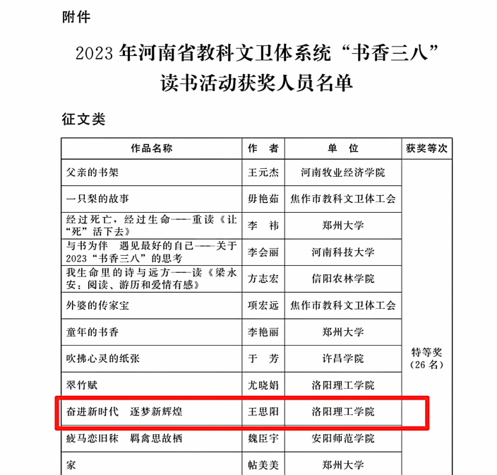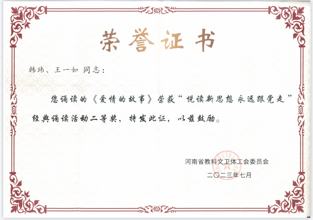 在工会活动中,我院韩玮老师报送的诵读作品《爱情的故事》荣获河南省教科文卫体系统“悦读新思想永远跟党走”经典诵读活动二等奖;王思阳老师撰写的《奋进新时代 逐梦新辉煌》荣获河南省教科文卫体系统“书香三八”读书活动征文特等奖。