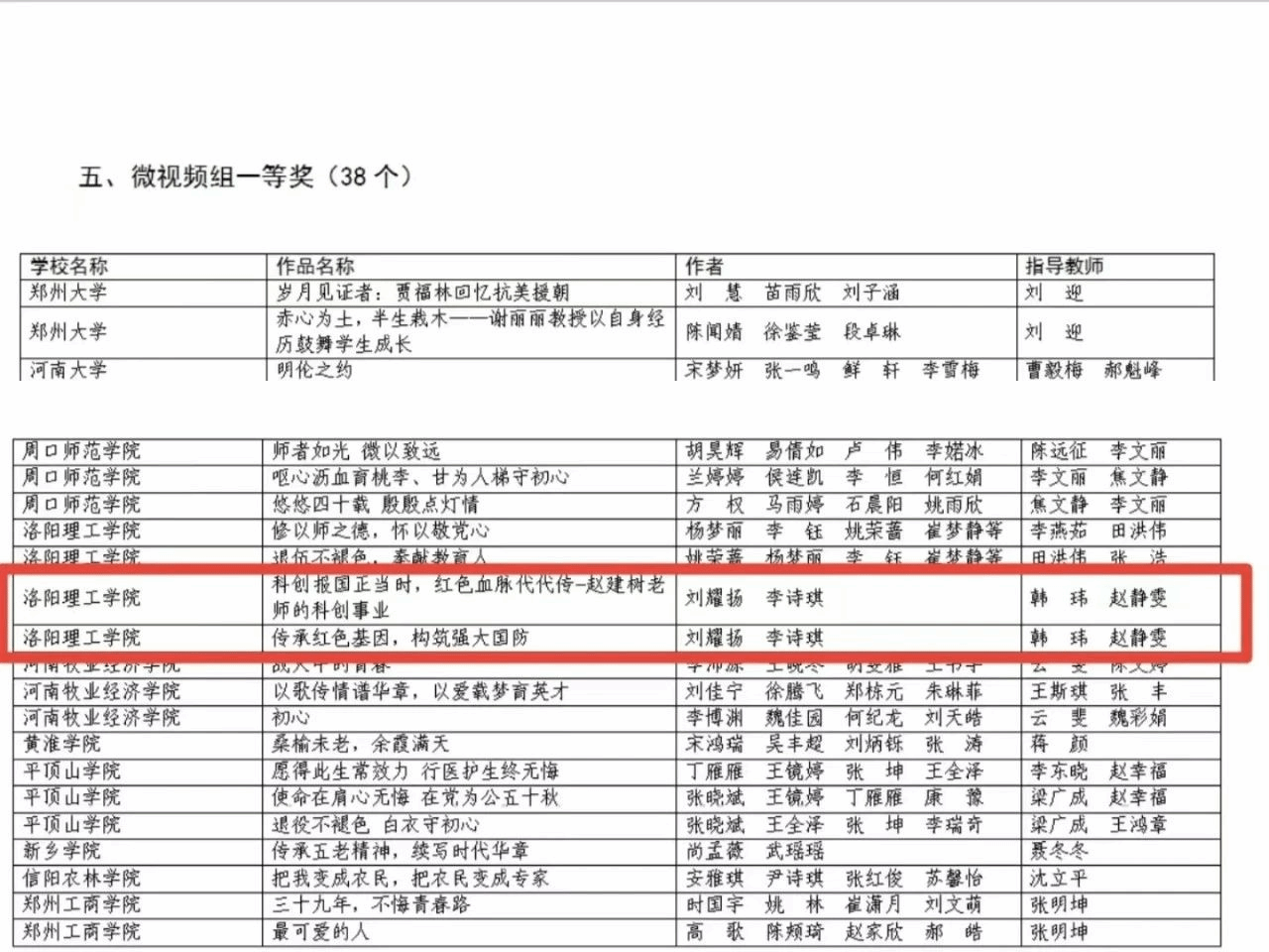 近日,河南省教育厅关工委下发了《关于公布全省高校“读懂中国”活动评审结果的通知》,我院韩玮老师指导的参赛作品《科创报国正当时,红色血脉代代传-赵建树老师的科创事业》和《传承红色基因,构筑强大国防》荣获微视频组一等奖。