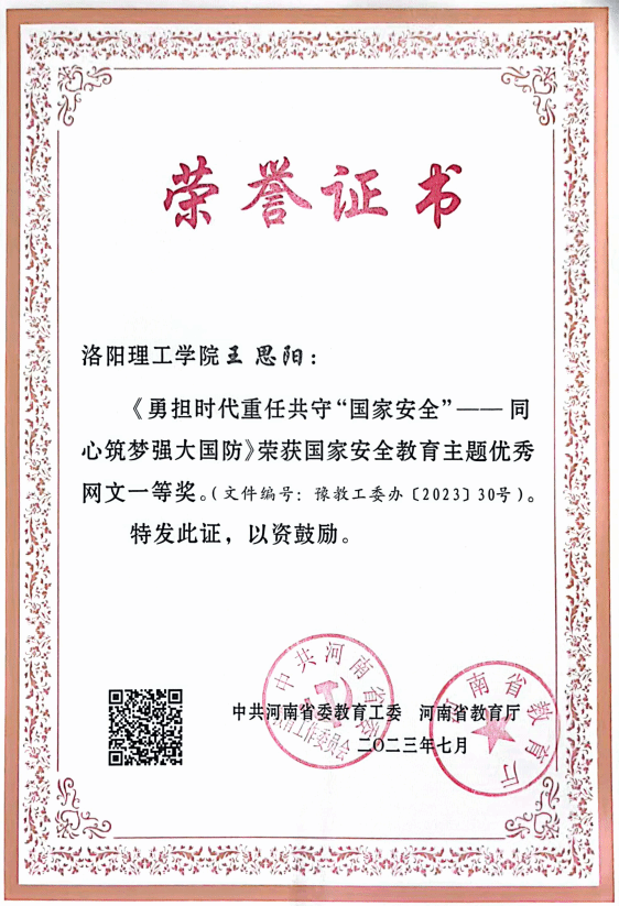 河南省教育厅下发了《关于国家安全教育主题优秀网文、短视频、平面设计作品征集活动评审结果的公示》,我院王思阳老师撰写的《勇担时代重任共守“国家安全”——同心筑梦强大国防》荣获优秀网文一等奖;张晨骏老师指导的短视频《来电有诈》荣获三等奖,张灏老师指导的短视频《不能拍的照片》荣获三等奖,赵天贺老师指导的短视频《你会怎么选》荣获三等奖。