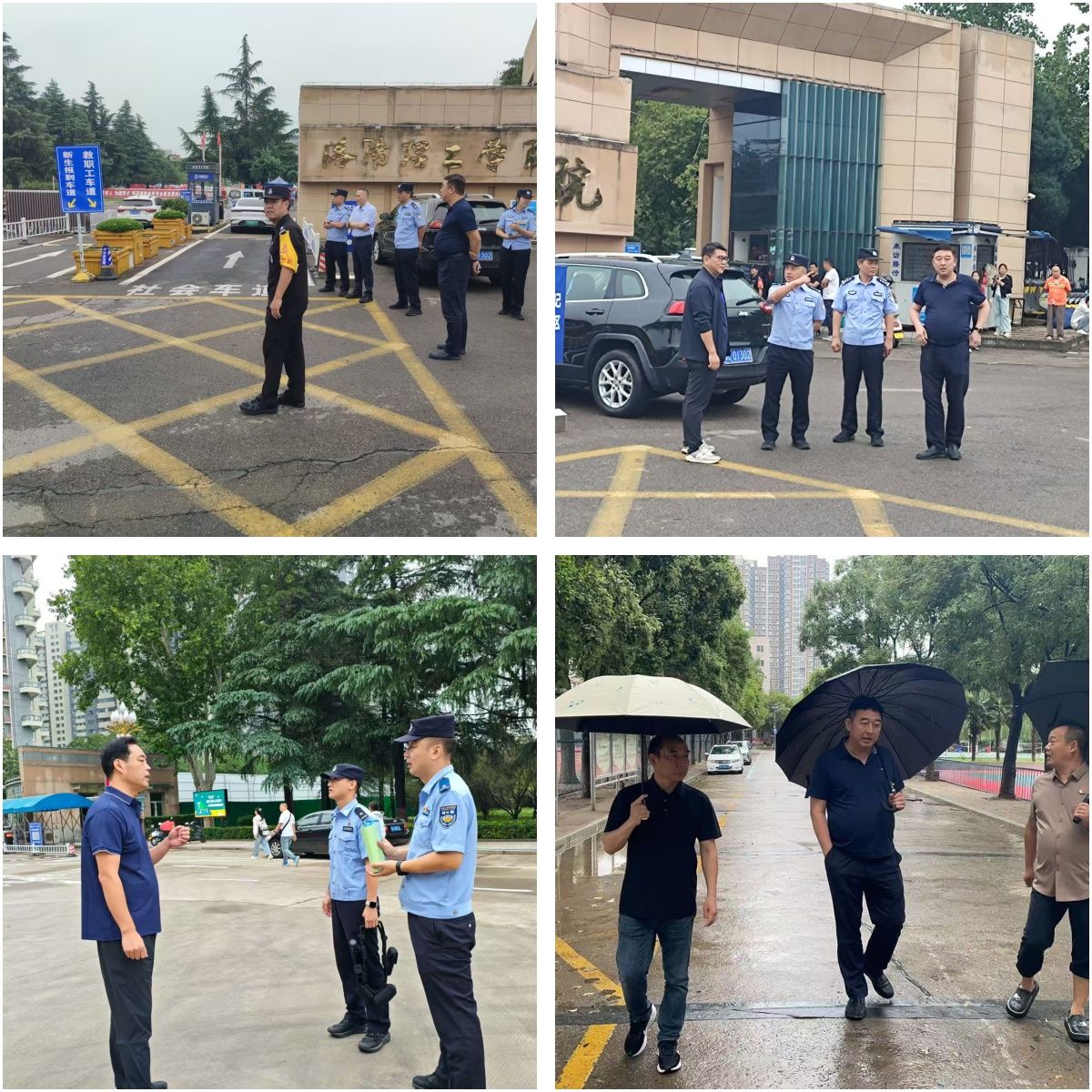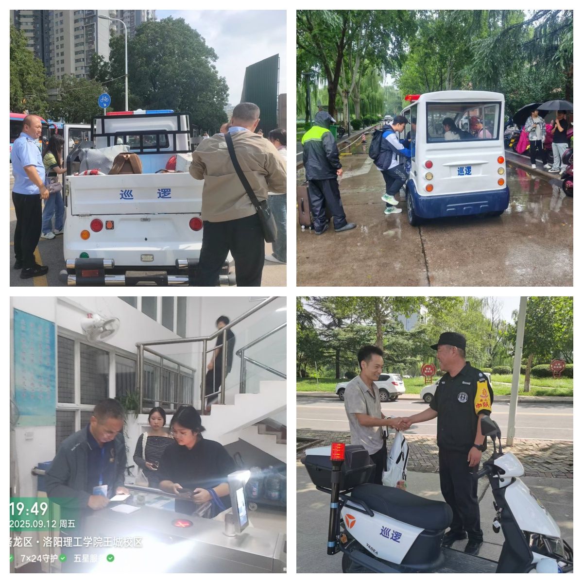 靠前指挥,保障校园秩序。新生人数多,又逢雨天,部分道路施工封闭,校园及周边交通压力大。保卫处绘制校园交通秩序图,标注行车方向与停车区,通过校园网和微信公众号提前发布。迎新当天,洛阳市交警增派警力疏导校外车流,保障周边道路畅通。校内政治保卫部全员上岗,增派安保人员,冒雨在关键点位疏导交通,指引新生及家长快速到达报到点,确保校园秩序平稳。