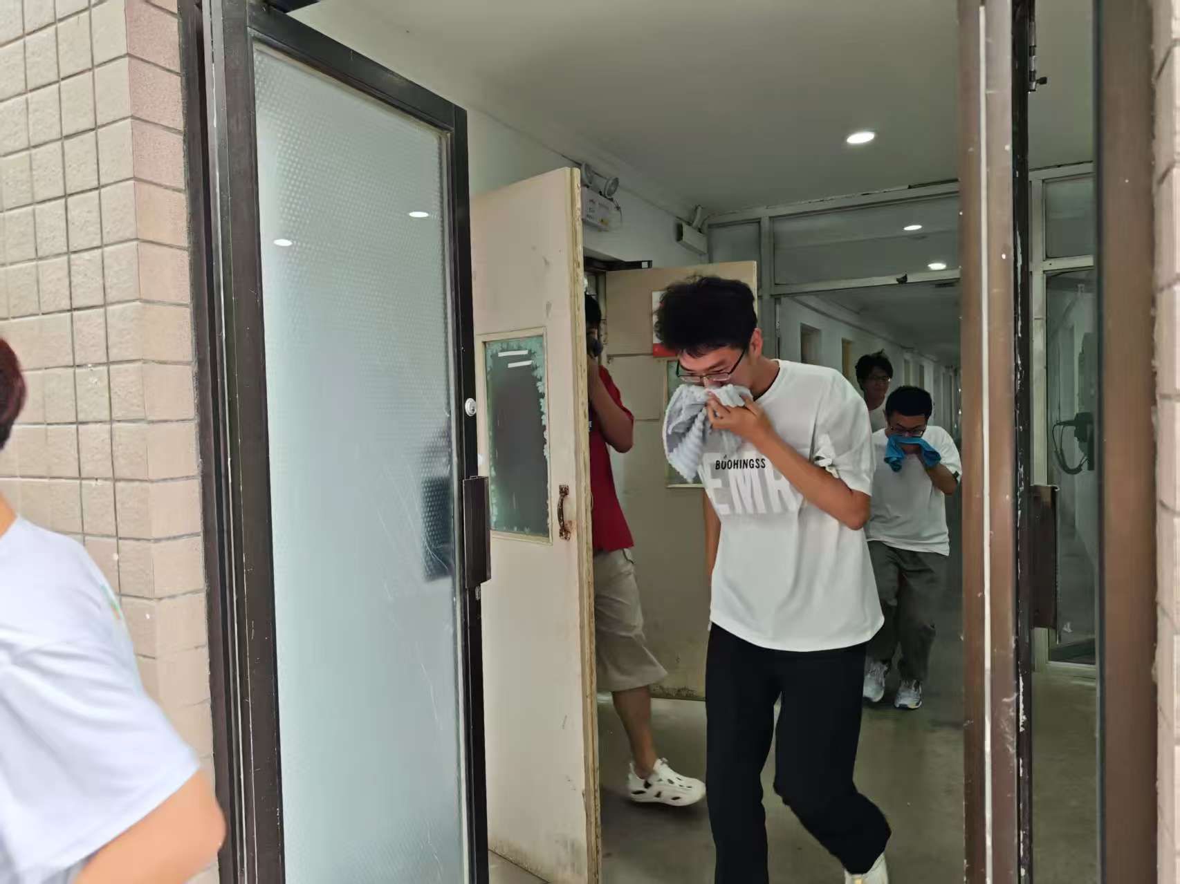 演练严格按照预案有序进行。现场通过拉烟的方式模拟子衿公寓发生火情。宿管人员发现“火情”后,立即拨打校园报警电话,并向领导汇报。政治保卫部、计算机学院与公寓中心迅速响应,第一时间启动应急预案,有条不紊地开展火情处置与人员疏散工作。