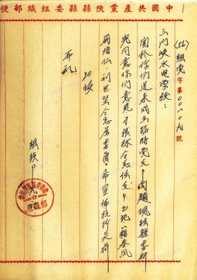 (1956年中国共产党陕县县委批准成立学校党支部的发文)