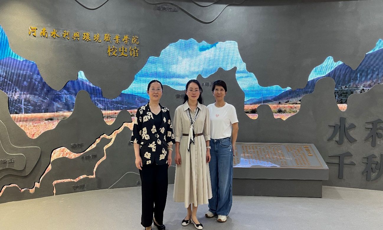 在河南水利与环境职业学院,调研组重点考察了该校400平方米校史馆的展陈体系。该馆目前正处于试运行阶段,以“水文化传承”为主线,分设[浸润·水之道]序厅、[渊流·水之迹]历史厅、[潮涌·水之沛]发展厅、[浩淼·水之梦]荣誉未来厅四大主题展区,通过建校初期手写教案、老式教学投影仪、老一辈水利人扎根一线群雕像等实物展陈布局,综合运用全息投影、数字沙盘等智能展陈技术,利用“水”字架构了学校70年薪火相传的发展面貌。