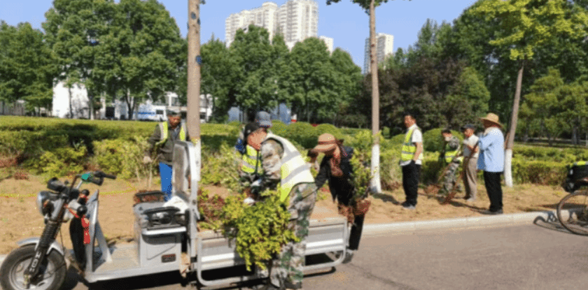 两个校区的绿化师傅通力协作,利用班组的三轮车和自己的三轮车将小叶女贞从开元校区南花坛运输至王城校区铭苑二餐厅西广场。