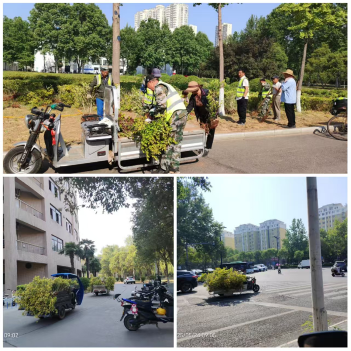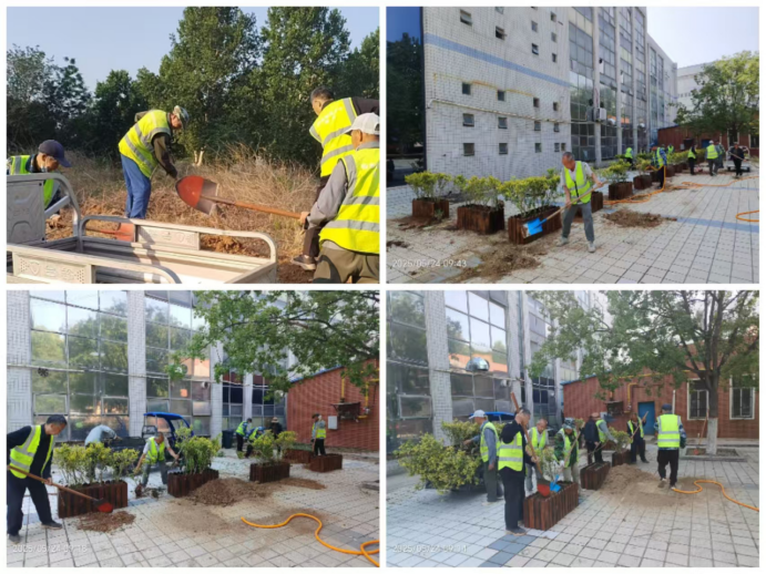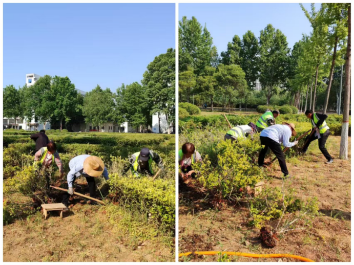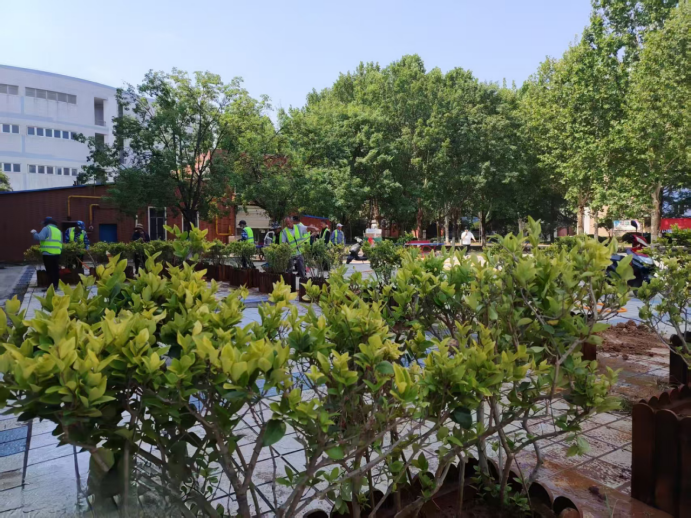 为提升王城校区铭苑二餐厅西广场景观,后勤保障处组织物业服务中心绿化人员于2025年5月24日上午,开展“移栽小叶女贞,优化校园景观布局”活动。