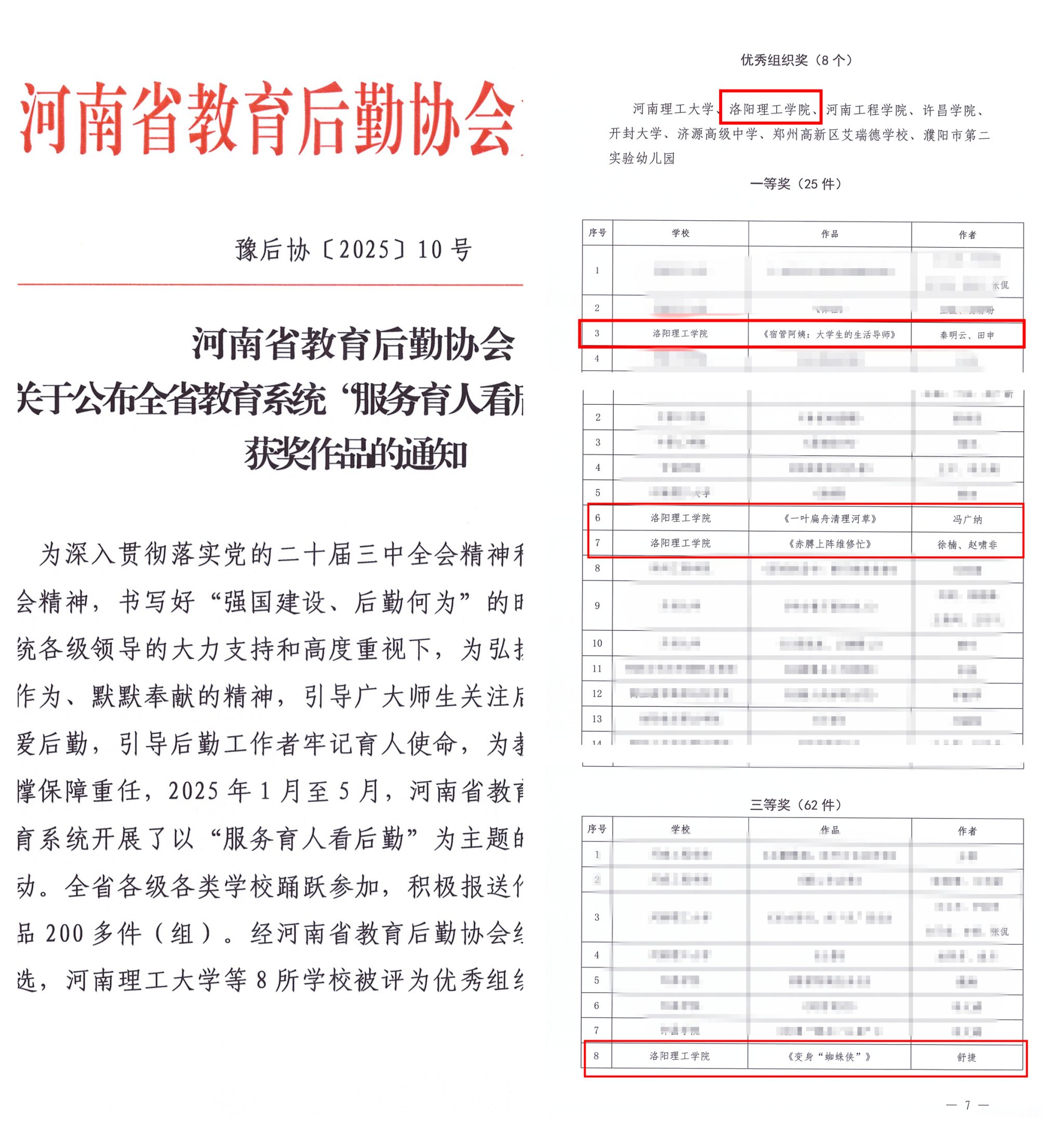 7月2日,河南省教育后勤协会公布了全省教育系统“服务育人看后勤”随手拍获奖结果。在全省众多参赛学校中,我校获评优秀组织奖。在200多件参赛作品中,我处后勤参赛作品《宿管阿姨:大学生的生活导师》荣获一等奖、《一叶扁舟清理河草》、《赤膊上阵维修忙》荣获二等奖,《变身“蜘蛛侠”》荣获三等奖。参赛作品真实反映了后勤保障处职工以师生为中心、默默奉献的一个个生动场景,深刻诠释了后勤职工甘居人后,勤为人先,担当尽责的良好精神风貌。