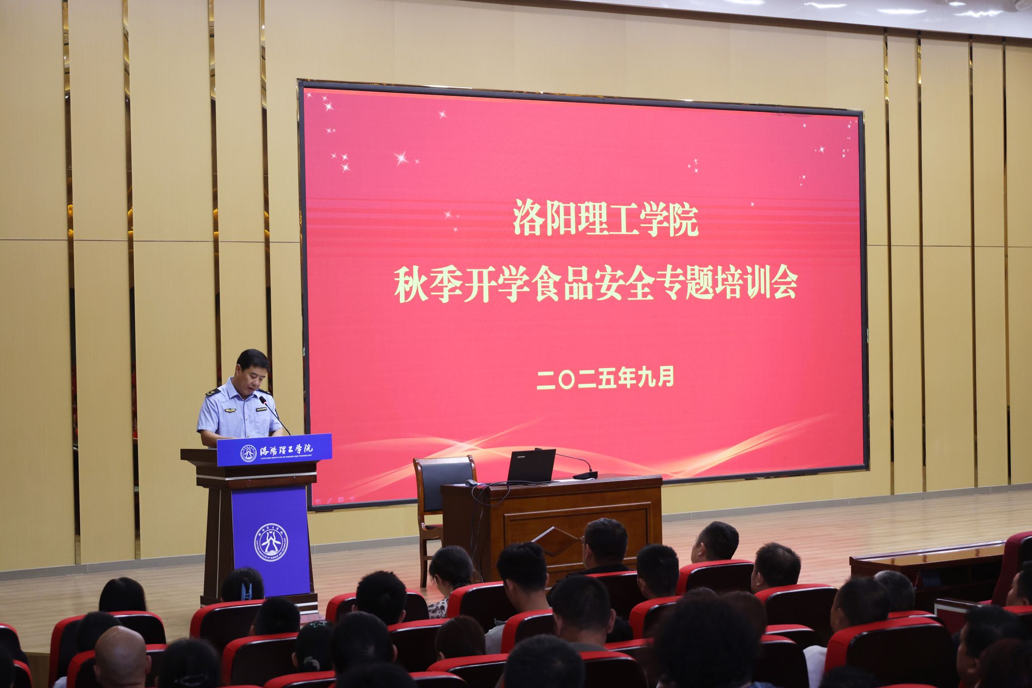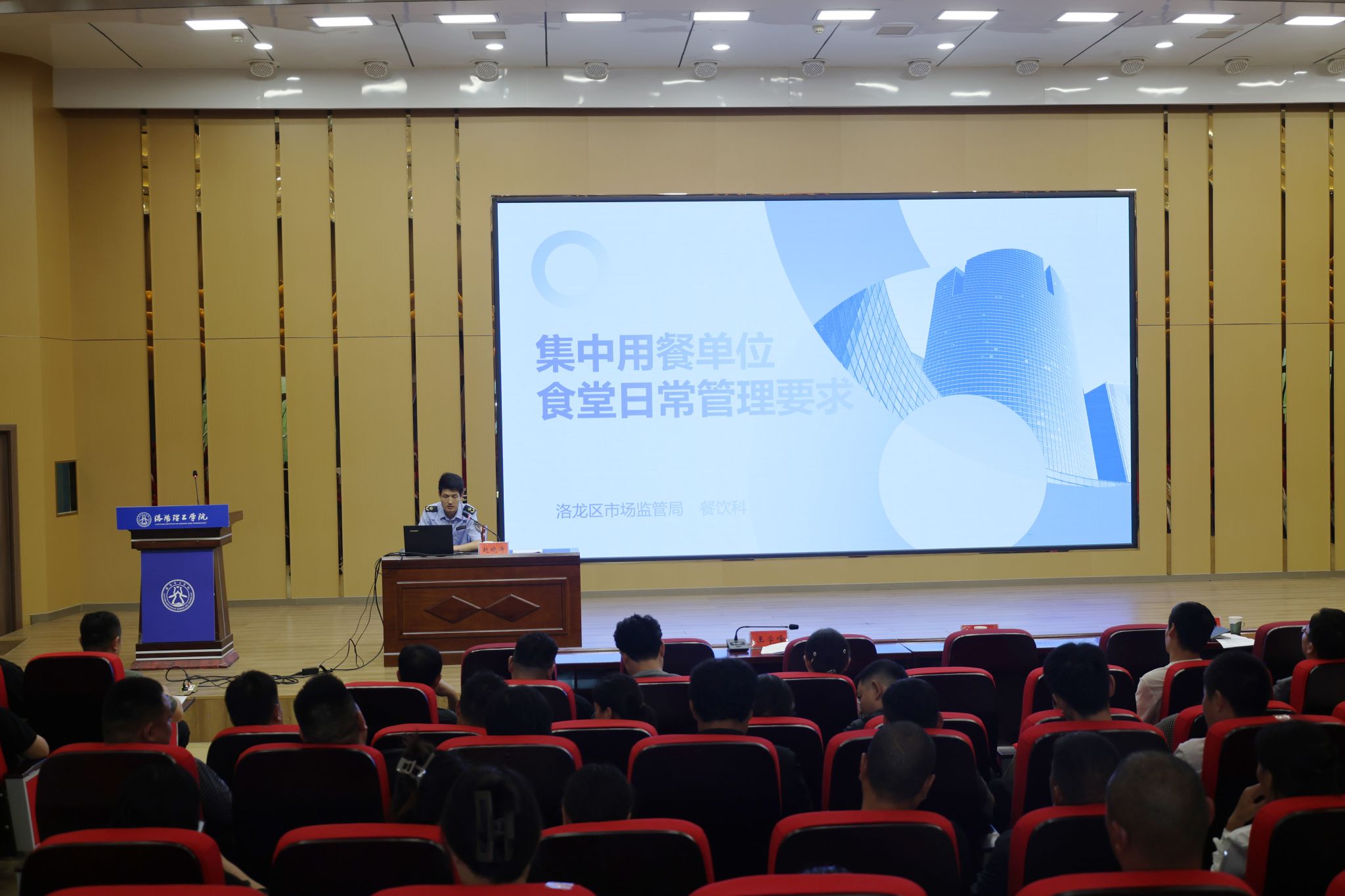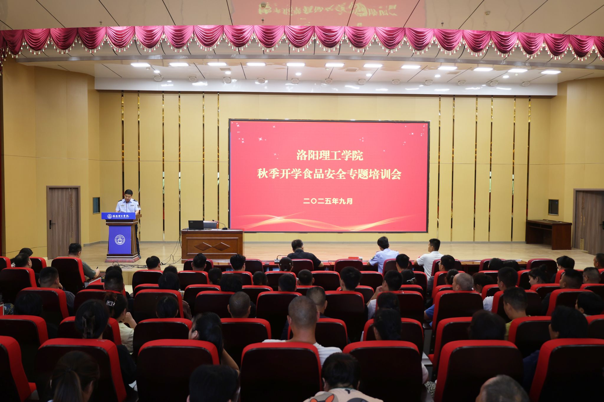 为进一步增强校园食品安全治理能力,确保师生“舌尖上的安全”,9月5日下午,我校组织召开秋季开学食品安全专题培训会。洛龙区市场监督管理局副局长吕瑞涛、餐饮股股长赵晓涛应邀出席培训会,后勤保障处处长王学峰、副处长王磊,饮食服务中心人员、原材料供货商、各餐饮公司负责人和各档口从业人员参加会议。会议由后勤保障处负责人主持。