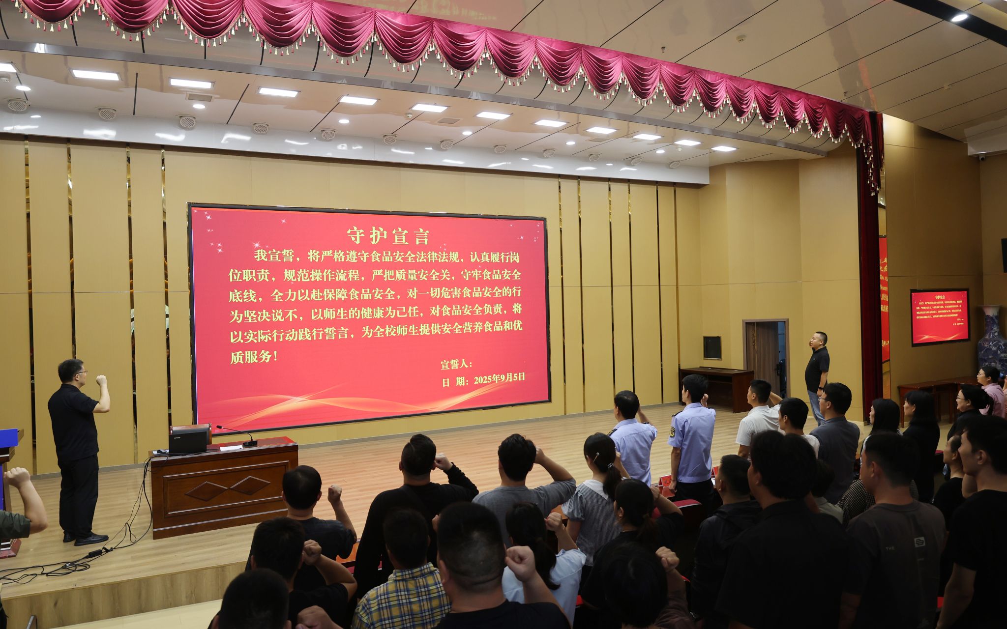 会后,全体餐饮人员进行了守护食品安全集体宣誓,对守护校园食品安全做出郑重承诺。