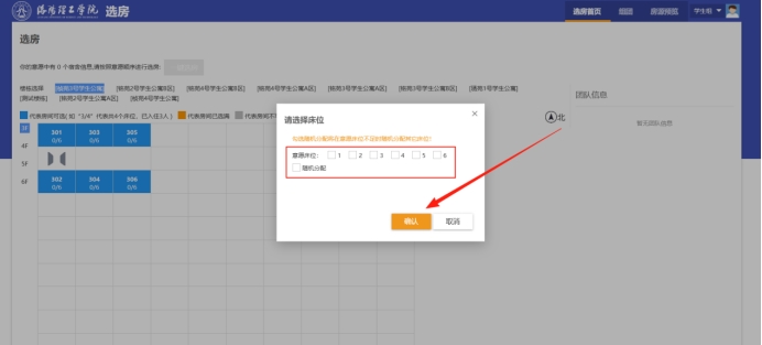 点击房间后出现如下图所示床位号选择框,勾选后点击确认则选房成功(注:只允许选择一次床位,谨慎确认):