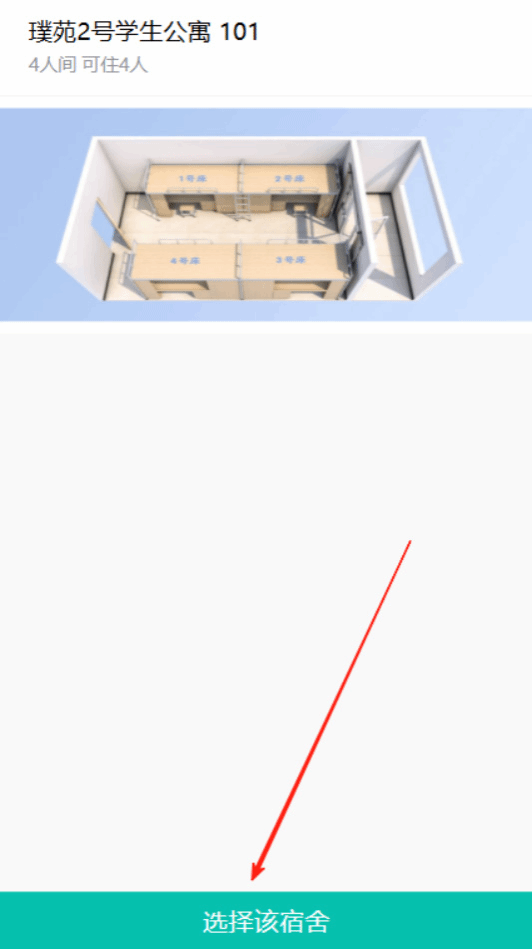 点击下方“选择该宿舍”→选择床位号后点击“确定”完成选宿操作(注:只允许选择一次床位,谨慎确认)。