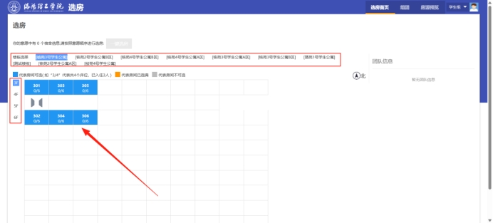 1.选房区域以学院班级划分。新生在班级区域内选房,可精确选择至床位号,先选先得。