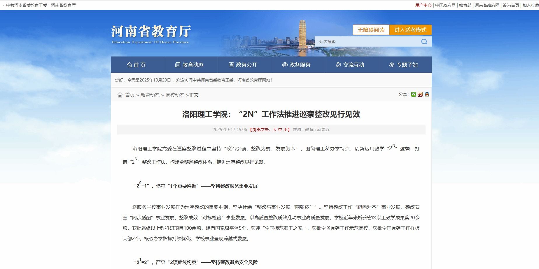 河南省纪委监委、河南省教育厅报道我校“2N”工作法推进巡察整改见行见效