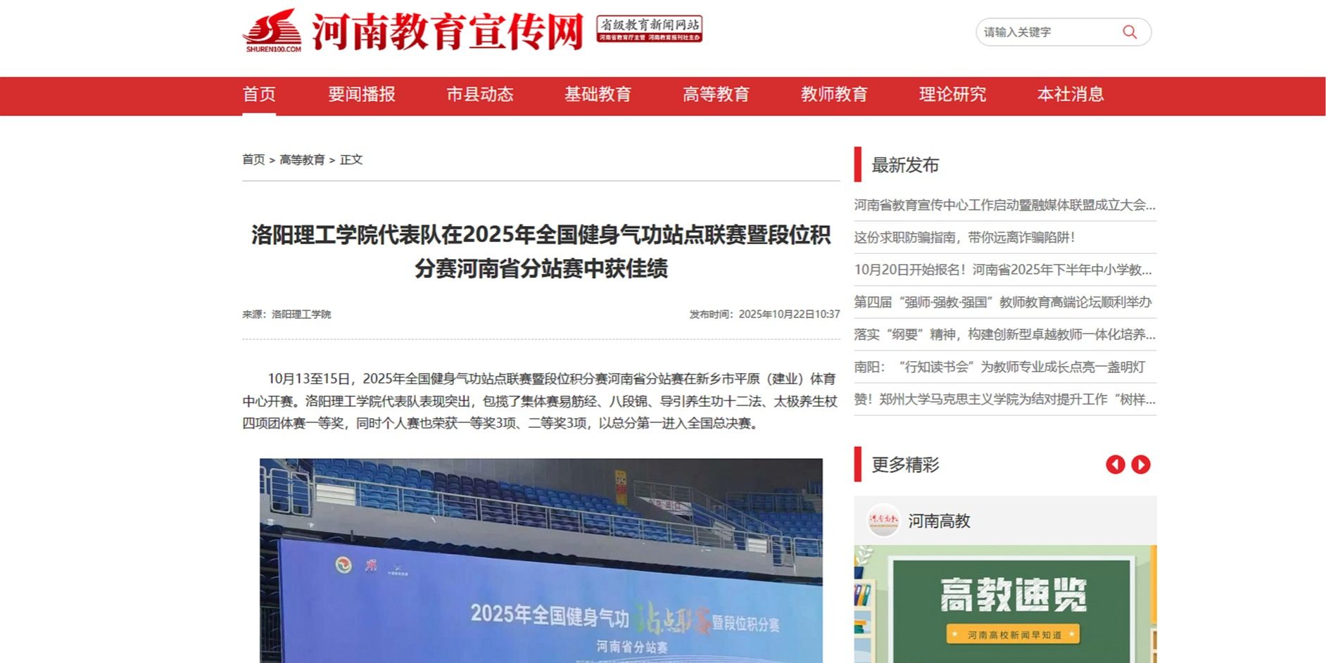 河南教育宣传网报道我校代表队在2025年全国健身气功站点联赛暨段位积分赛河南省分站赛中获佳绩