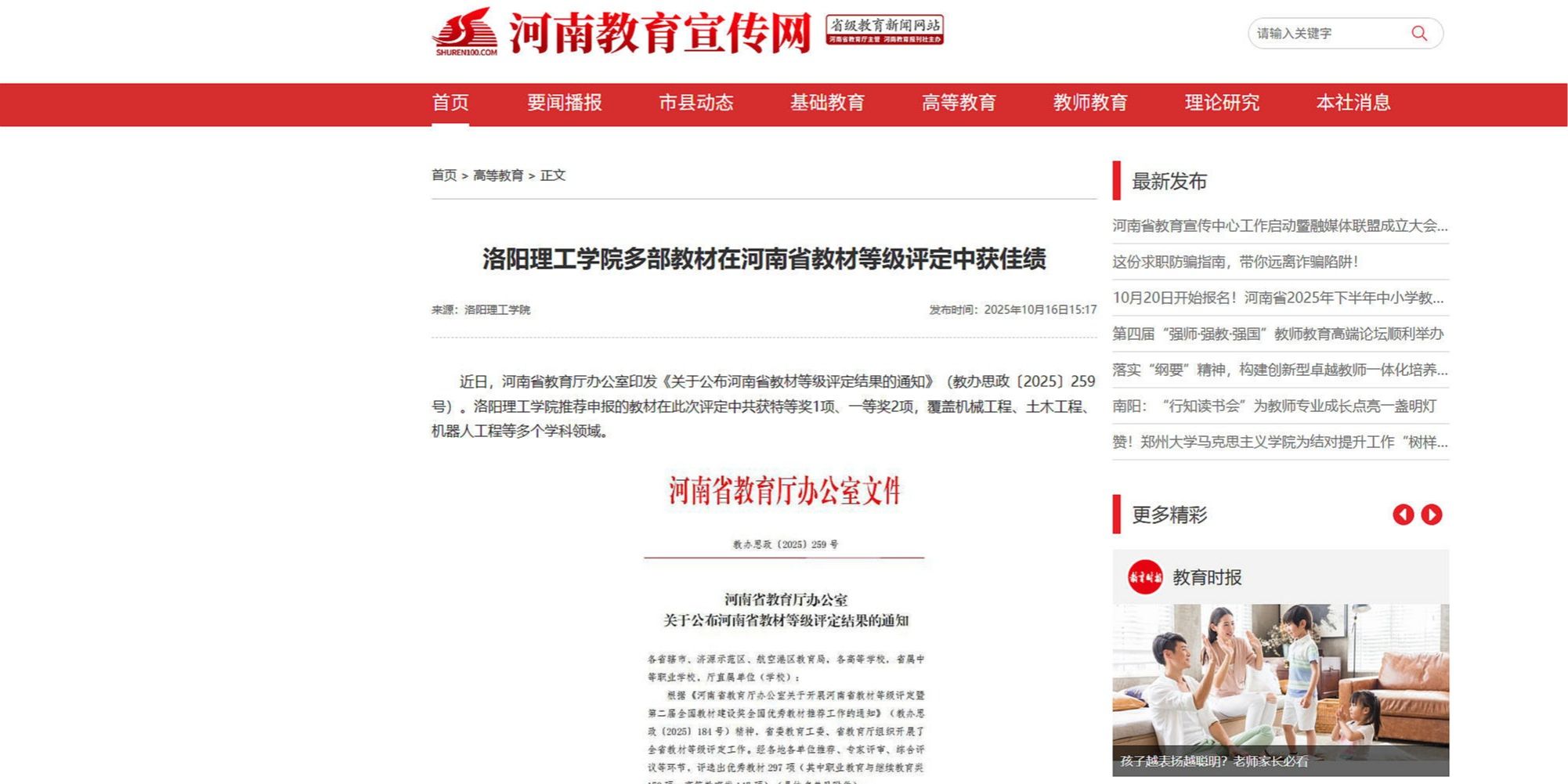 河南教育宣传网报道我校多部教材在河南省教材等级评定中获佳绩