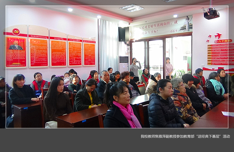 12月5日下午,由教育部、国家语委组织实施的“送经典下基层”系列活动之专家讲座在洛龙区太康东路街道办事处鸿儒社区服务中心举行。河南省普通话水平测试员、我校教育科学与音乐学院教育系教师焦雅萍副教授应邀作题为《幸福从绘本阅读开始》专题讲座。