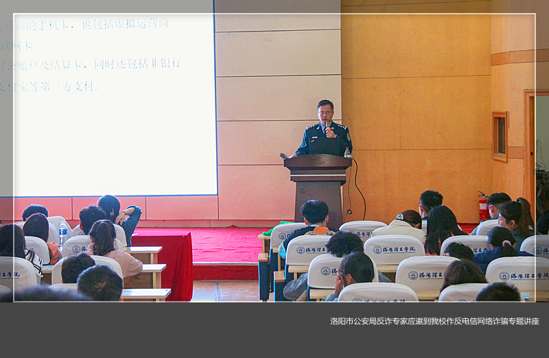 按照学校2021年度综治工作会议精神和反诈专项工作推进会工作部署,3月25日下午,洛阳市反电信网络诈骗专家、洛阳市公安局刑侦支队新型犯罪侦查大队副大队长杜鹏,应邀在开元校区图书馆报告厅作反电信网络诈骗专题讲座。300余名学生代表现场聆听了讲座。