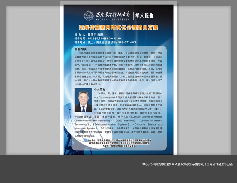 6月18日,我校孙泽宇教授应西安电子科技大学电子工程学院邀请参加第四届多源感知与信息处理国际研讨会,并为信息与通信工程专业学生作了题为《无线传感器网络优化分簇路由方案》的学术报告,与会博士、硕士研究生300余人听取了报告。