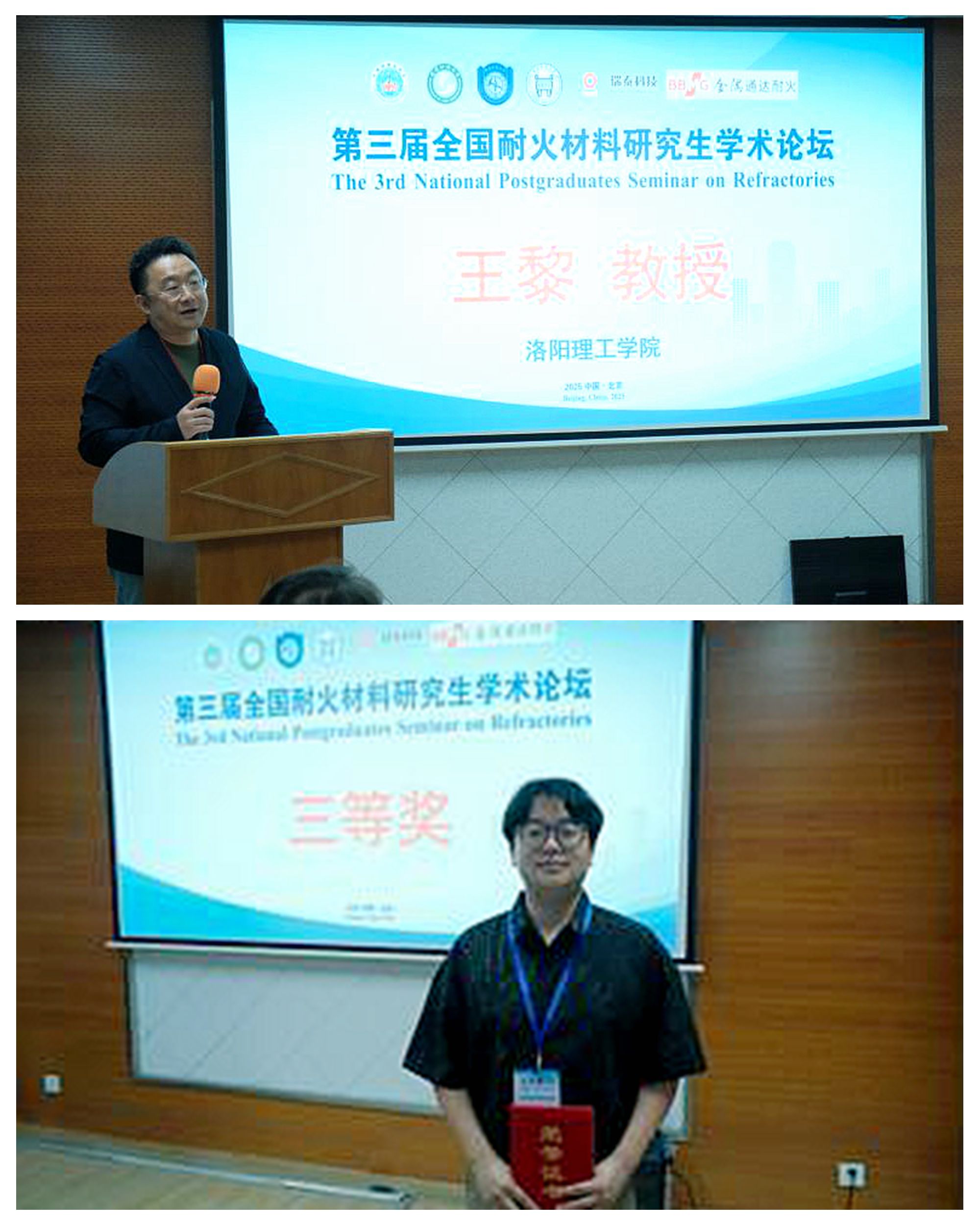 我校材料科学与工程学院王黎教授受邀参加论坛并主持相关环节,其指导的江西理工大学联合培养研究生郭育森(合作导师:董宾宾副教授)的学术报告“Preparation of Magnesium-Aluminum Spinel Hollow Spheres and Their Application Research in Magnesia-Carbon Refractory Materials”在激烈的竞争中脱颖而出荣获大会报告三等奖,展现了我校在耐火材料领域研究生培养的优秀成果。