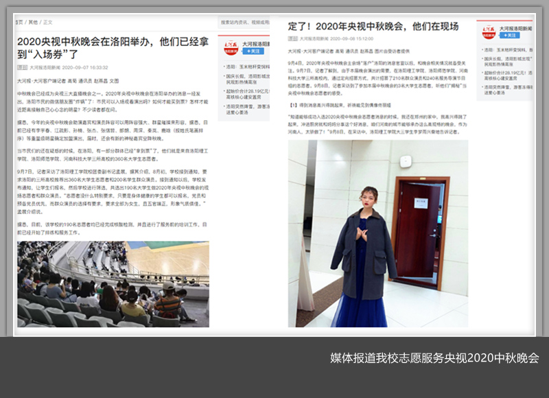 9月7日,大河报洛阳新闻以《2020央视中秋晚会在洛阳举办,他们已经拿到“入场券”了》为题对我校安排190名大学生服务2020央视中秋晚会进行报道;猛犸新闻东方今报以《央视中秋晚会不设观众席 群众演员和志愿者来自洛阳这三所高校》为题进行报道。9月8日,大河报洛阳新闻以《定了!2020年央视中秋晚会,他们在现场》专题对我校志愿者进行了报道。