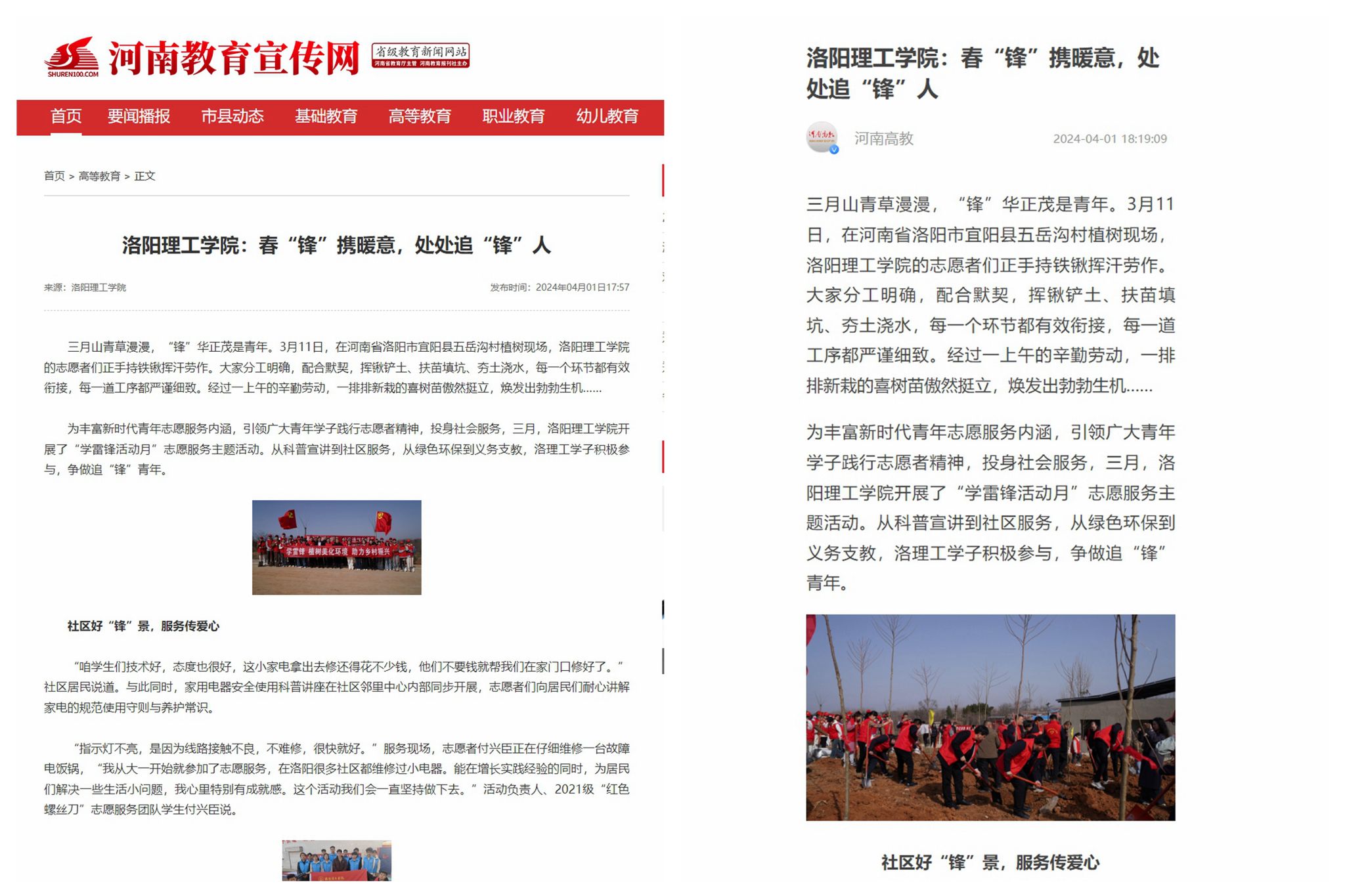 4月1日,河南教育新闻网、《河南高教》大象号报道我校开展“学雷锋活动月”志愿服务主题活动。