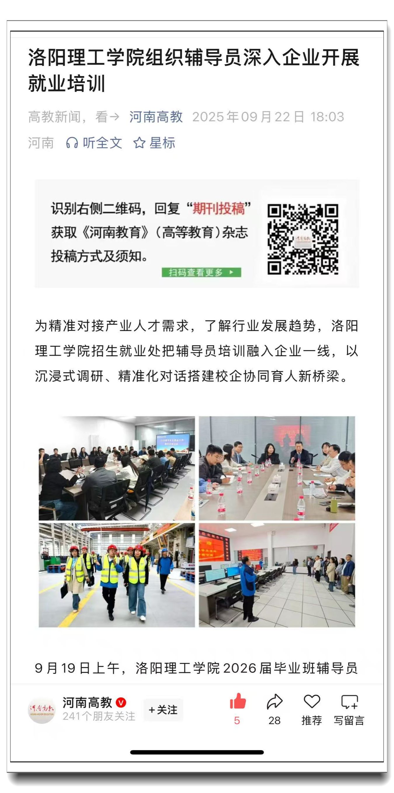 “河南高教”微信公众号,2025年9月22日,《乐鱼(中国)组织辅导员深入企业开展就业培训》