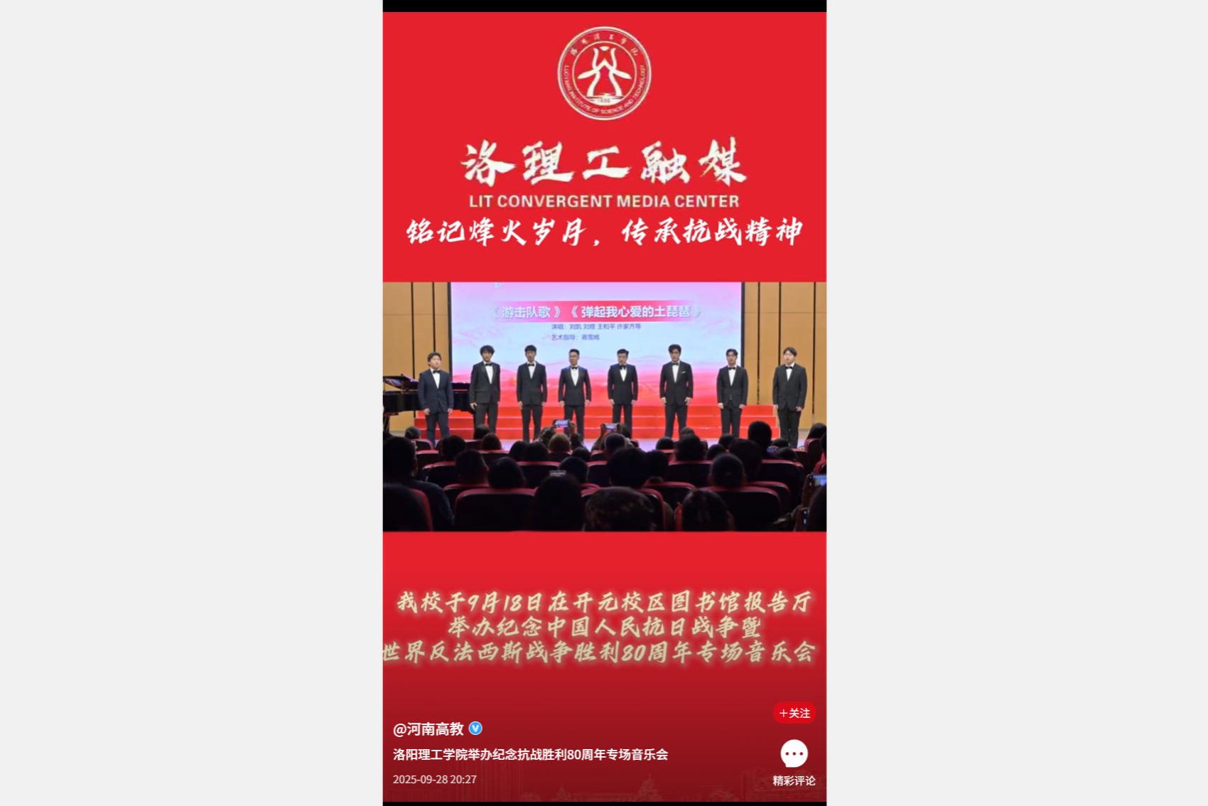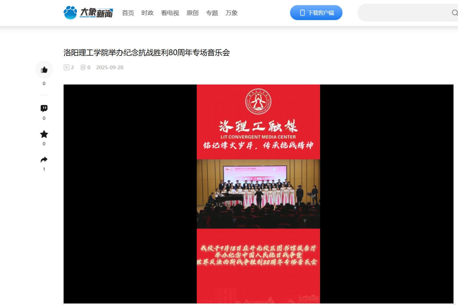 9月28日,大象新闻客户端、顶端新闻客户端分别以短视频形式报道我校举办纪念中国人民抗日战争暨世界反法西斯战争胜利80周年专场音乐会。