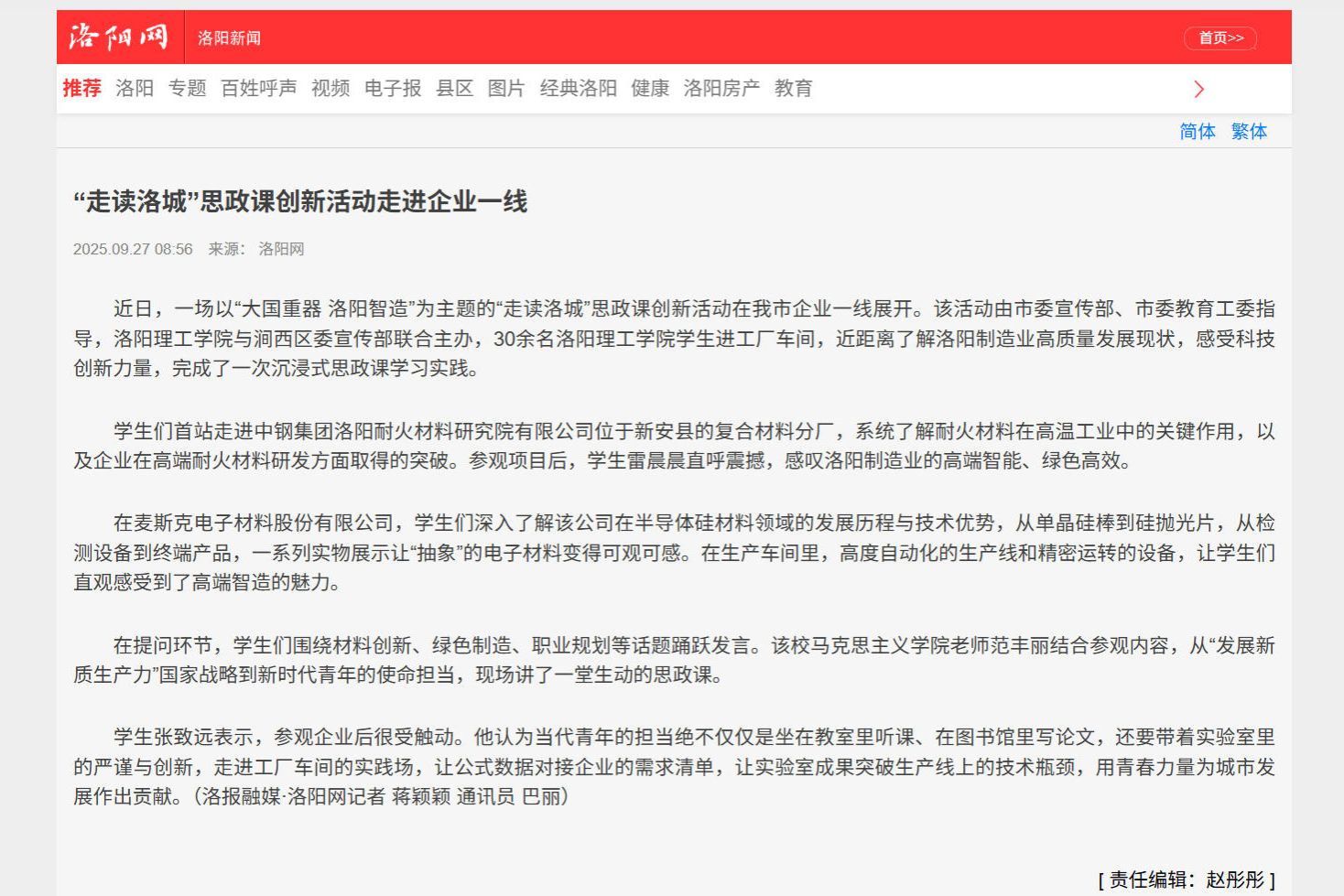 洛阳网,2025年9月27日,《“走读洛城”思政课创新活动走进企业一线》