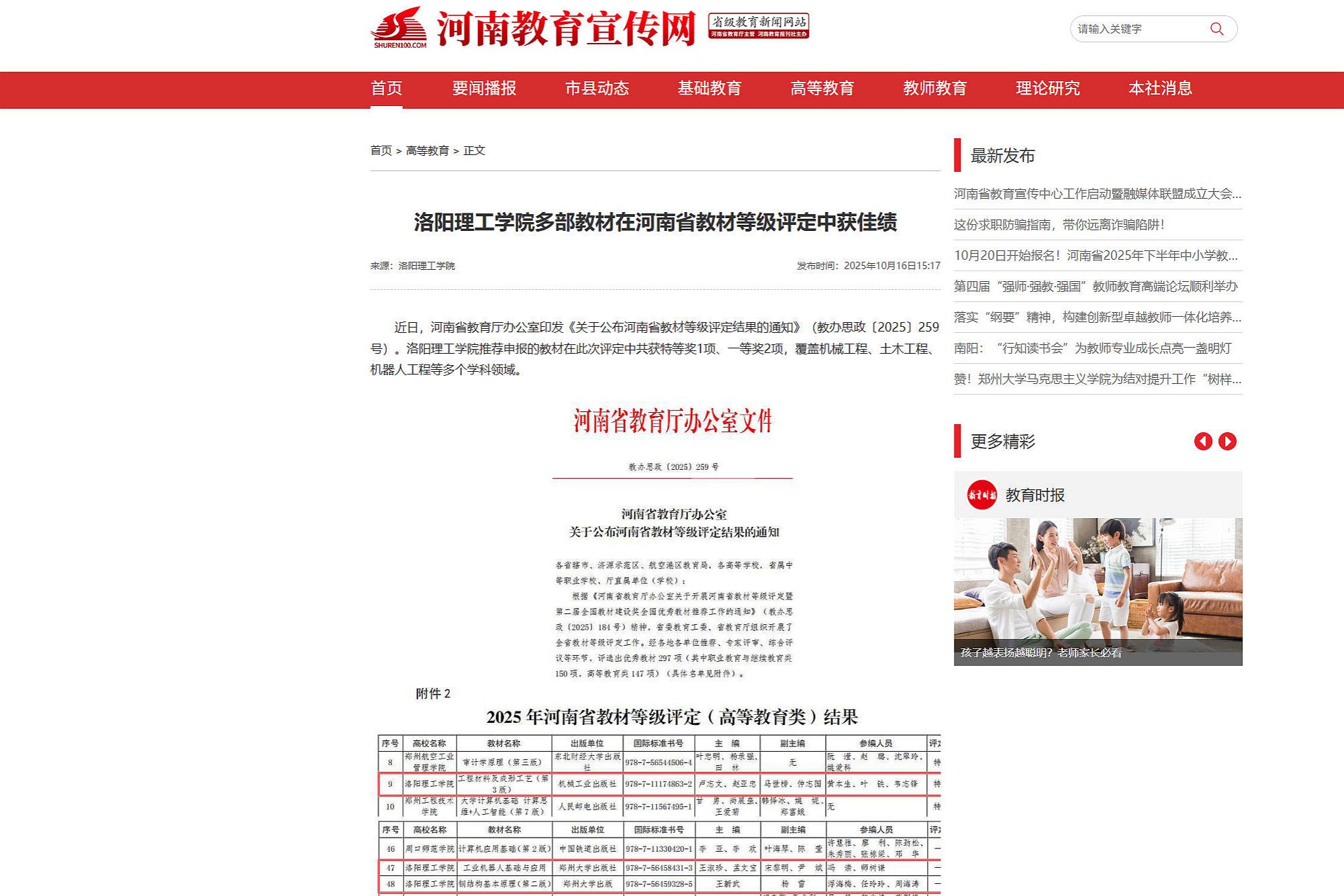 河南教育宣传网,2025年10月16日,《乐鱼(中国)多部教材在河南省教材等级评定中获佳绩》