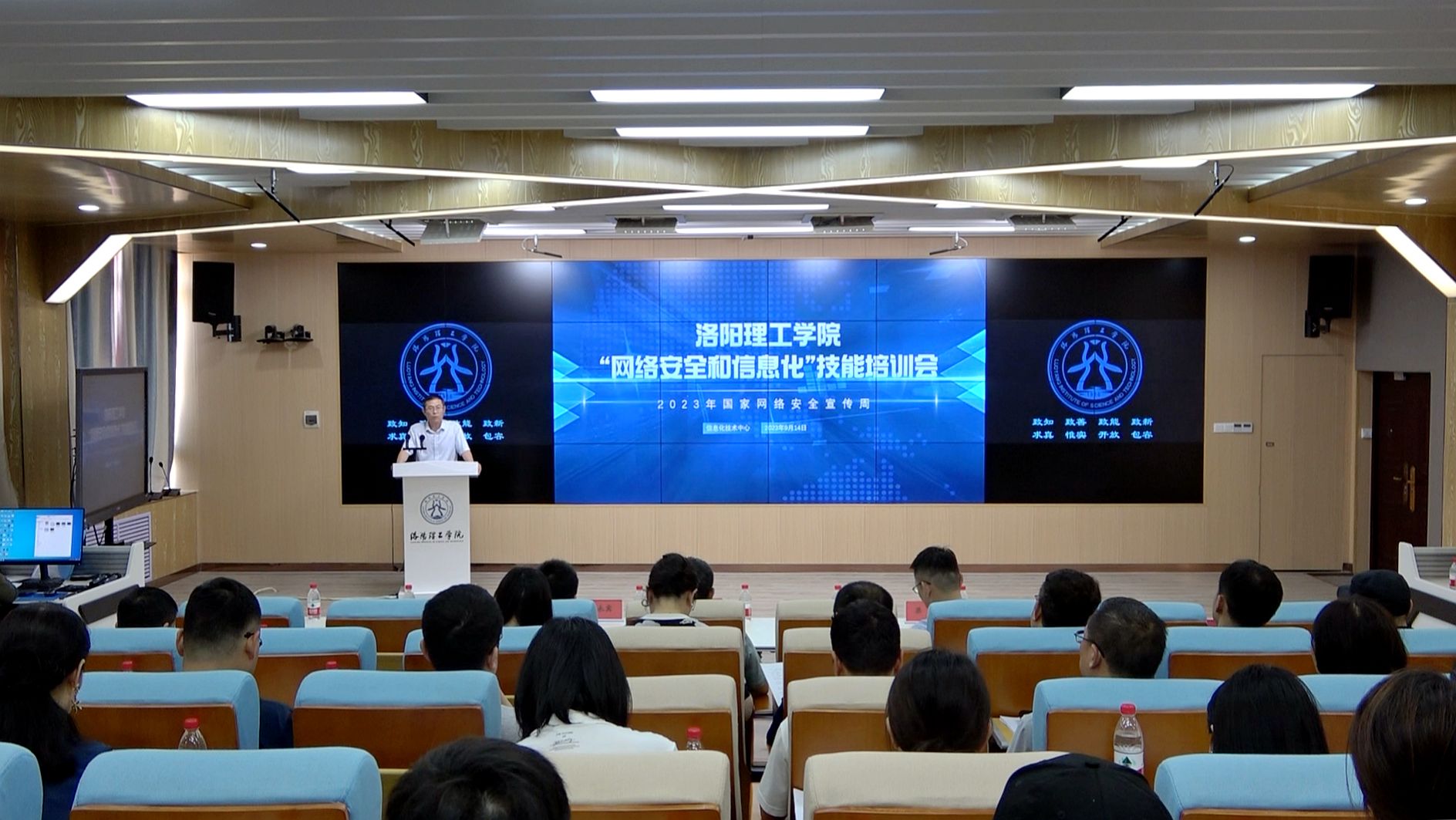 9月14日下午,我校信息化技术中心在王城校区公共教学楼AE507智慧教室举办网络安全和信息化技能培训会,此次培训会是我校开展的国家网络安全宣传周系列活动之一。校网络安全和信息化领导小组办公室主任李传锋、信息化技术中心副主任梁凯、网络安全领域行业专家及校属各部门信息管理员、网络管理员参加培训会。