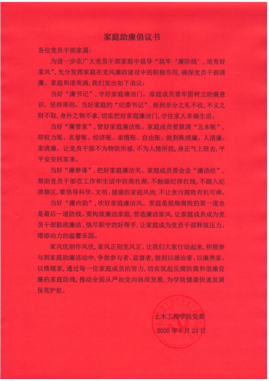 为切实发挥家庭家教家风在廉洁教育中的作用,引导全体师生崇德向善、崇俭尚廉,6月25日土木工程学院党委在全院教职工党员干部中开展为期一周的“家庭助廉助防线 廉洁心语树家风”活动。