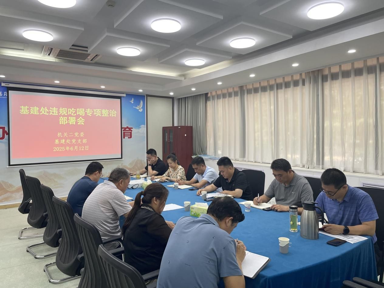 2025年6月12日,机关二党委基建处党支部在开元校区图书馆106会议室召开违规吃喝专项整治深入部署会。机关二党委基建处党支部全体参加会议,会议由党支部书记姚红梁主持。