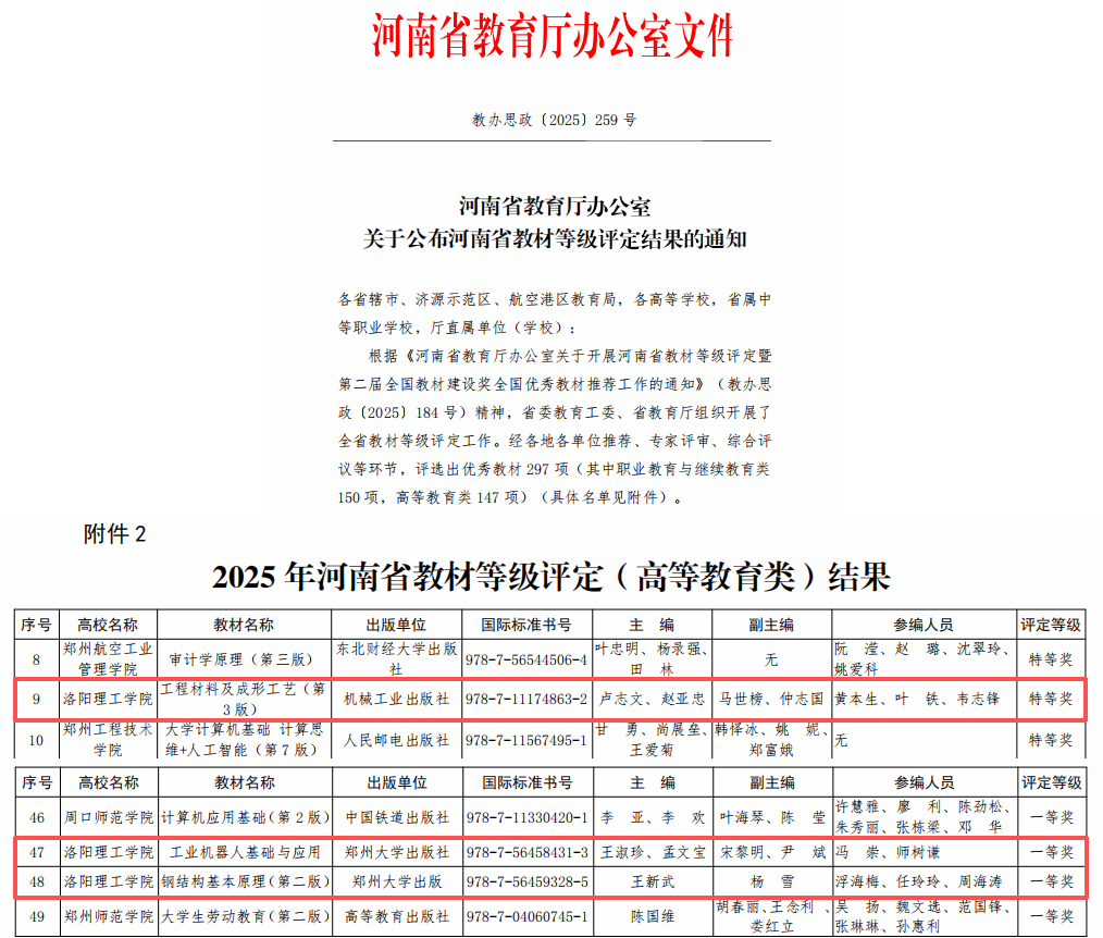 近日,河南省教育厅办公室印发《关于公布河南省教材等级评定结果的通知》(教办思政〔2025〕259号)。我校推荐申报的教材在此次评定中表现突出,共获3项省级奖项,其中特等奖1项、一等奖2项,标志着我校教材建设与教育教学改革工作取得标志性突破。