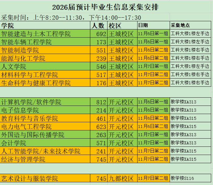 时间安排见下图,请根据学院的采集时间,按班级顺序通知学生依次到指定地点拍照。