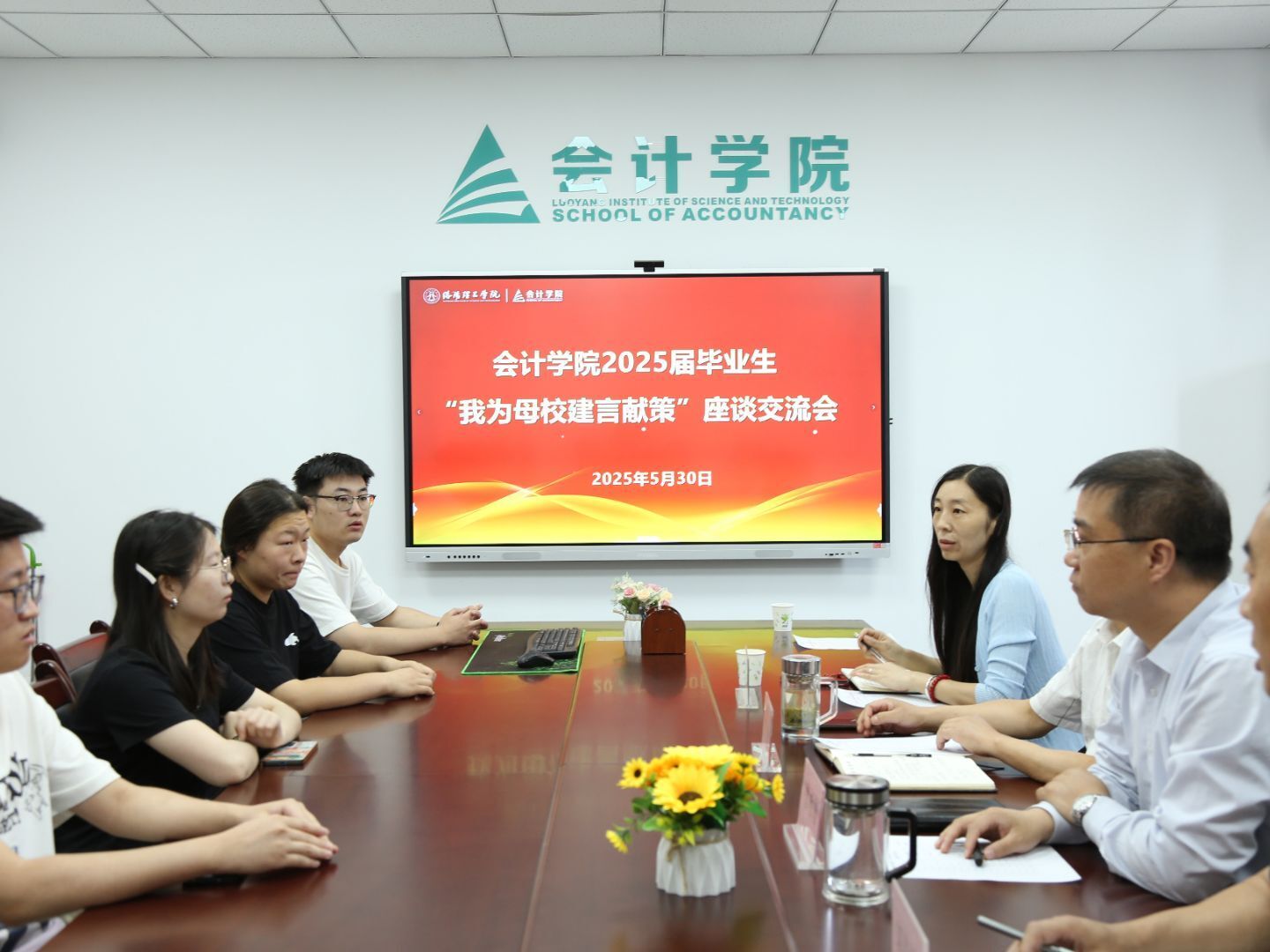 为广泛征集毕业生对学校发展的意见建议,持续优化教育教学与管理服务工作,5月30日,会计学院在教学楼D302举办2025届毕业生“我为母校建言献策”座谈交流会。会计学院党委书记曹相智,院长马腾,副院长蔡洁,教学秘书赵文丽,学工办主任李雷喆,团委副书记温跃卫,毕业班辅导员李迪、宋梦奇以及部分毕业生共同参会,会议由党委副书记郭春林主持。