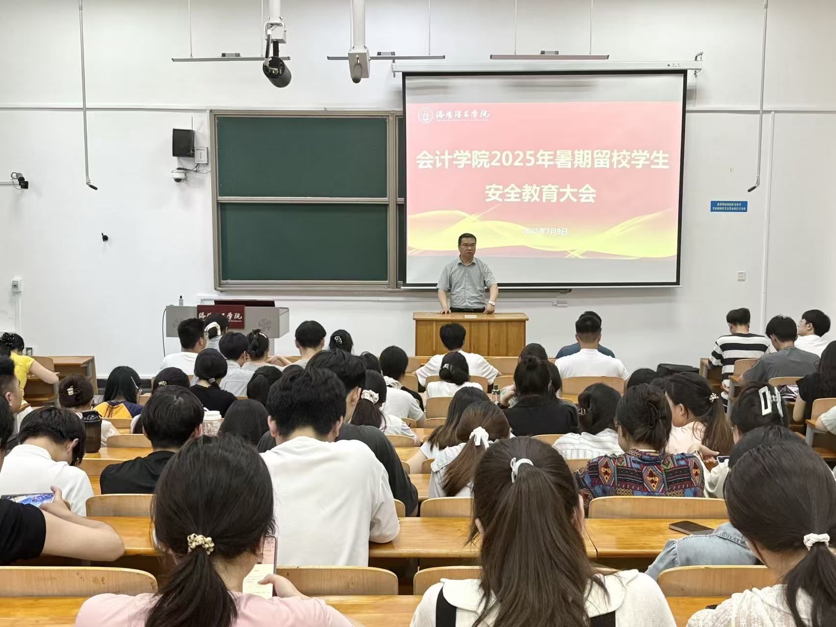 为保障暑期留校学生人身财产安全,为2026届考研留校学生提振精神、明确备考方向,7月9日,会计学院举行暑期留校学生安全教育大会暨考研留校学生动员大会。学院党委书记曹相智、院长马腾、学工办主任李雷喆、团委副书记温跃卫、辅导员张翰林参会,党委副书记郭春林主持会议。