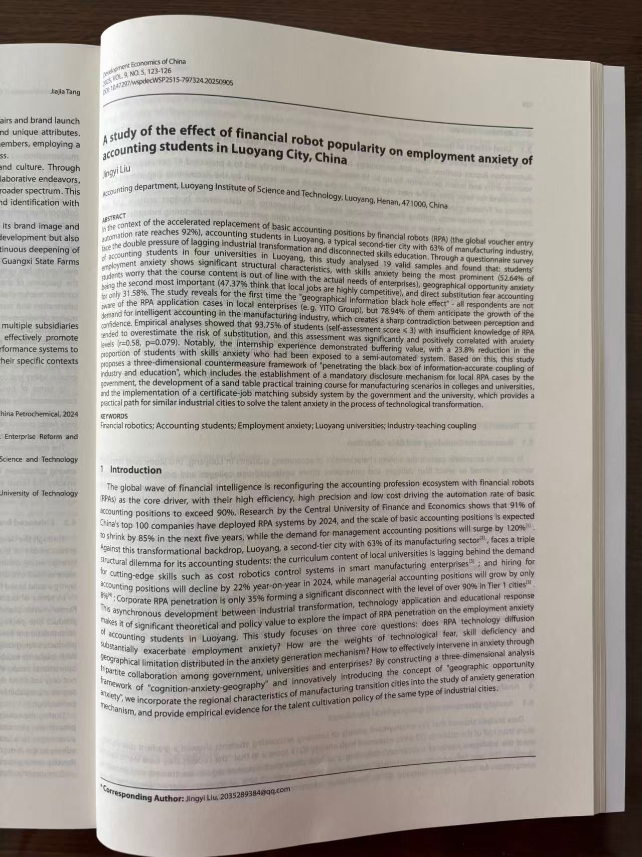 近日,我院学子B22080607刘静怡的学术论文《A study of the effect of financial robot popularity on employment anxiety of accounting students in Luoyang City, China》成功发表于国际期刊《Development Economics of China》。该成果不仅是学生科研能力的亮眼展现,更成为我院以科创实践反哺人才培养、培育“应用型+创新型”会计人才的生动例证。