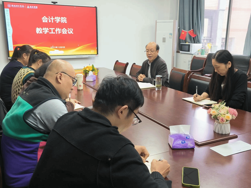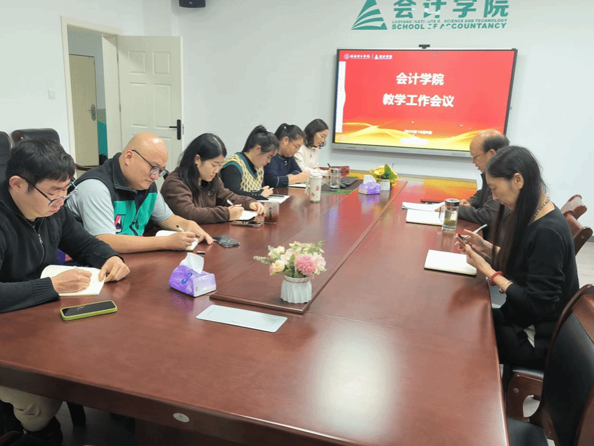 2025年10月9日,会计学院召开新学期教学工作会议,深入探讨数智财务微专业建设及毕业论文选题等关键教学工作。会议由副院长蔡洁主持,院长马腾、教学秘书赵文丽、会计学系主任张莉、财务管理系主任刘云江、审计与信息化系副主任刘蔚、财务管理系副主任谷海天、会计学系副主任袁豪文参加此次会议。