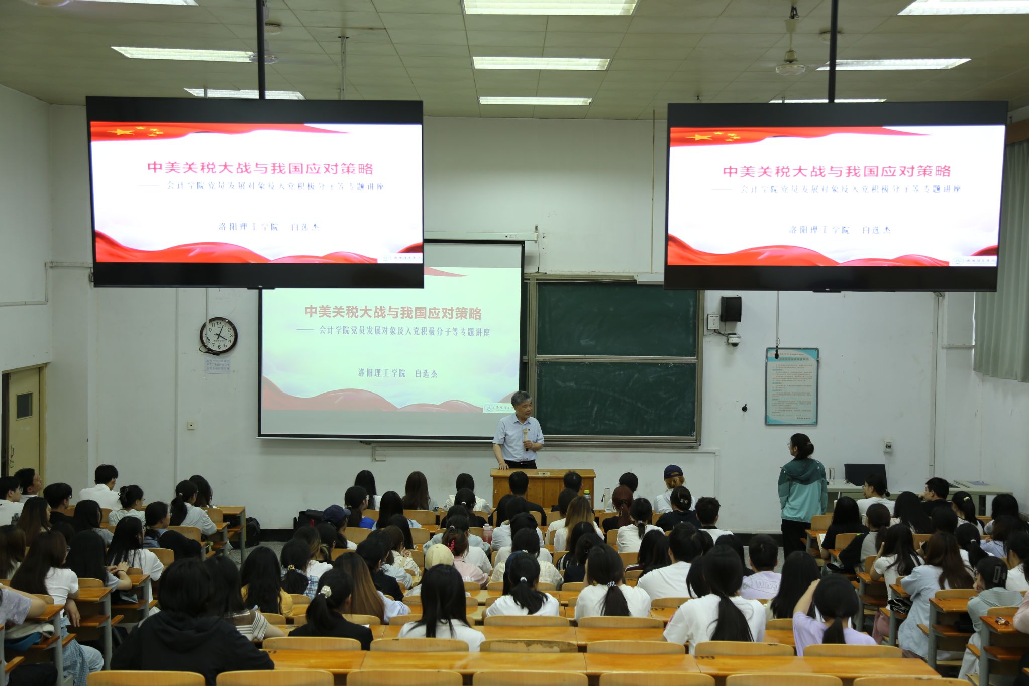 为拓宽学生国际视野,深化对全球经济格局的认知,厚植家国情怀与使命担当,会计学院于5月22日在教学楼D1举办形势与政策课宣讲活动。白选杰老师以《中美关税大战与我国应对策略》为题,带来一场极具深度的专题讲座。会计学院全体发展对象、入党积极分子和入团积极分子参加。